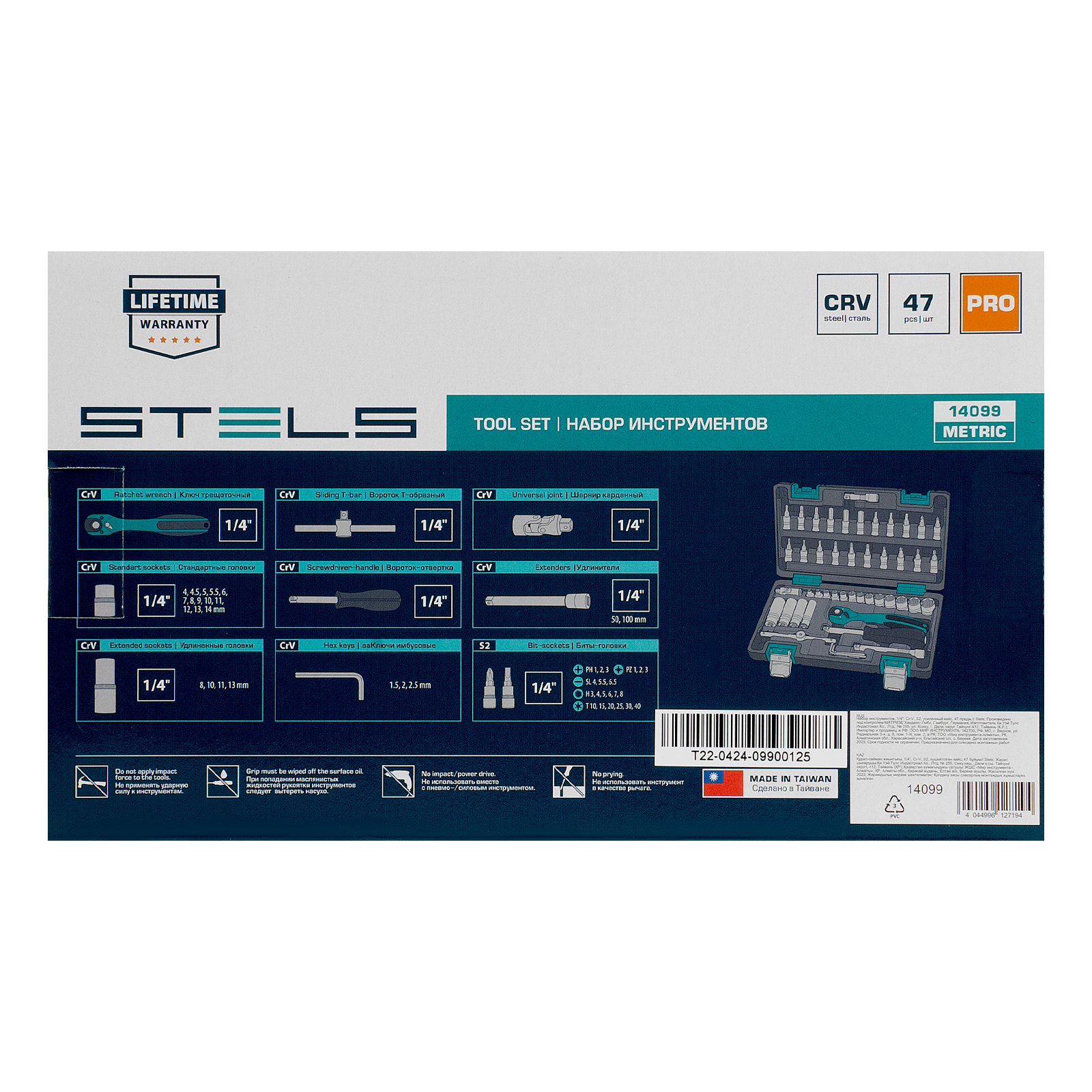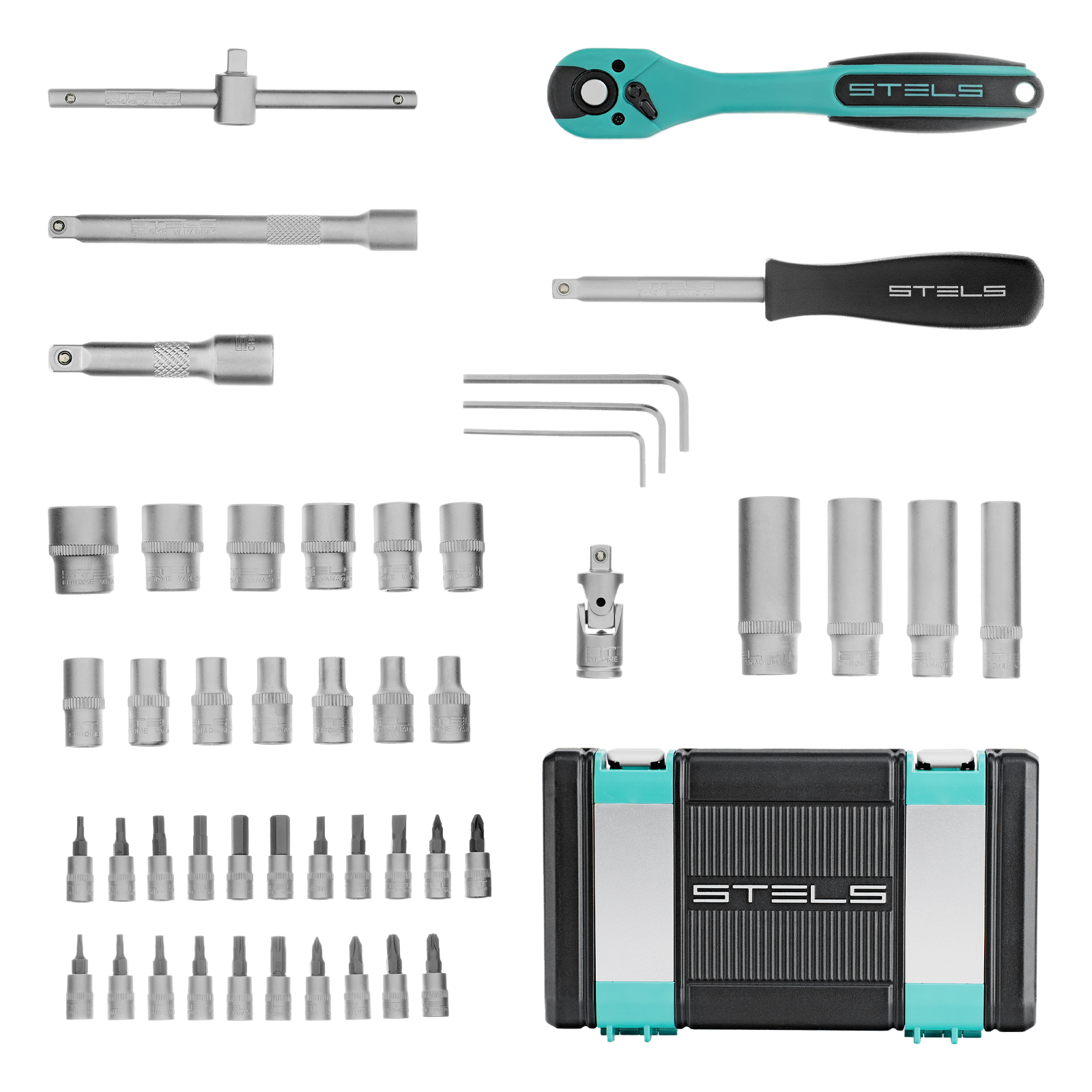 Набор инструментов Stels 14099 в ударопрочным пластиковом кейсе состоит из 47 предметов с присоединительным квадратом 1/4″, из стали CrV и S2, и предназначен для выполнения слесарно-монтажных работ. Включает инструменты и насадки для работы с резьбовыми крепежами, а также удлинители и т-образный вороток, облегчающие работу в труднодоступных местах. Набор предназначен для профессионального использования в автомастерской, будет полезен и для решения бытовых задач.