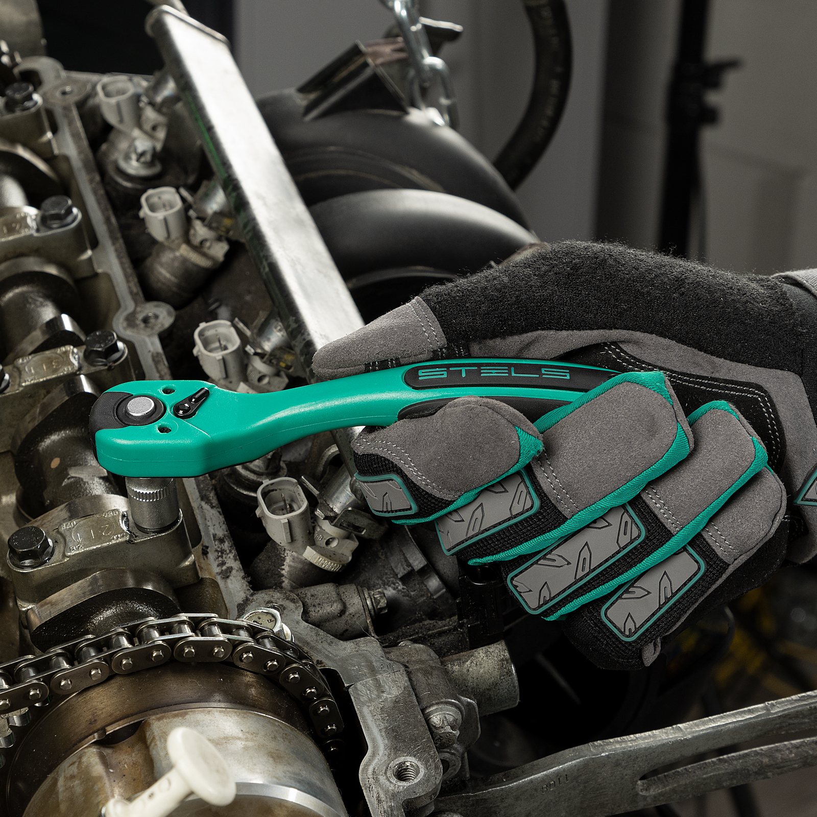 - Защита от разрушения — антикоррозийное покрытие "матовый хром" предотвращает появление ржавчины, а рукоятка трещотки из полипропилена и резины устойчива к воздействию бензина и масла.