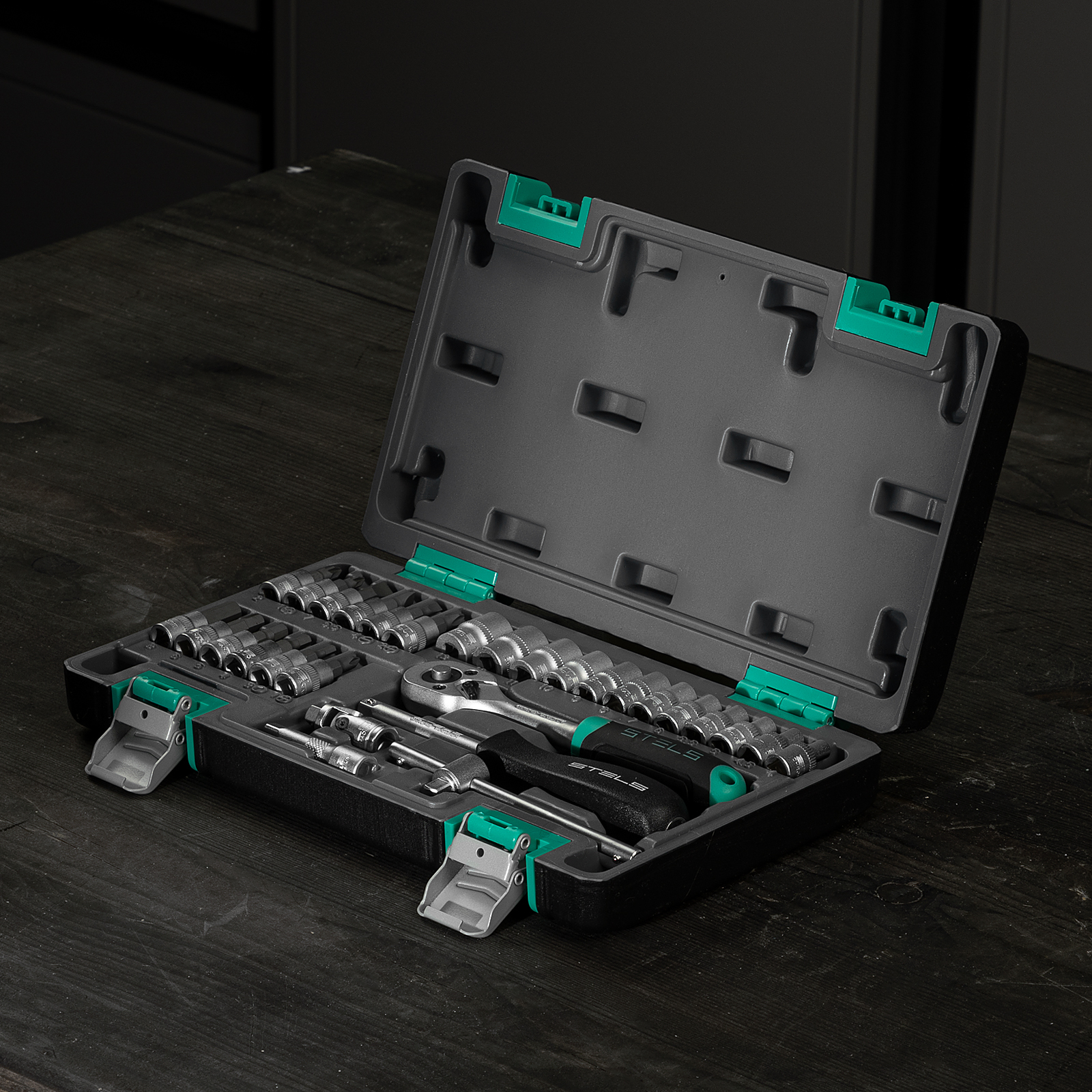 Набор инструментов Stels 14100 в ударопрочным пластиковом кейсе состоит из 29 предметов с присоединительным квадратом 1/4″, из стали CrV и S2, и предназначен для выполнения слесарно-монтажных работ. Включает инструменты и насадки для работы с резьбовыми крепежами, а также удлинитель и т-образный вороток, облегчающие работу в труднодоступных местах. Набор предназначен для профессионального использования в автомастерской, будет полезен и для решения бытовых задач.