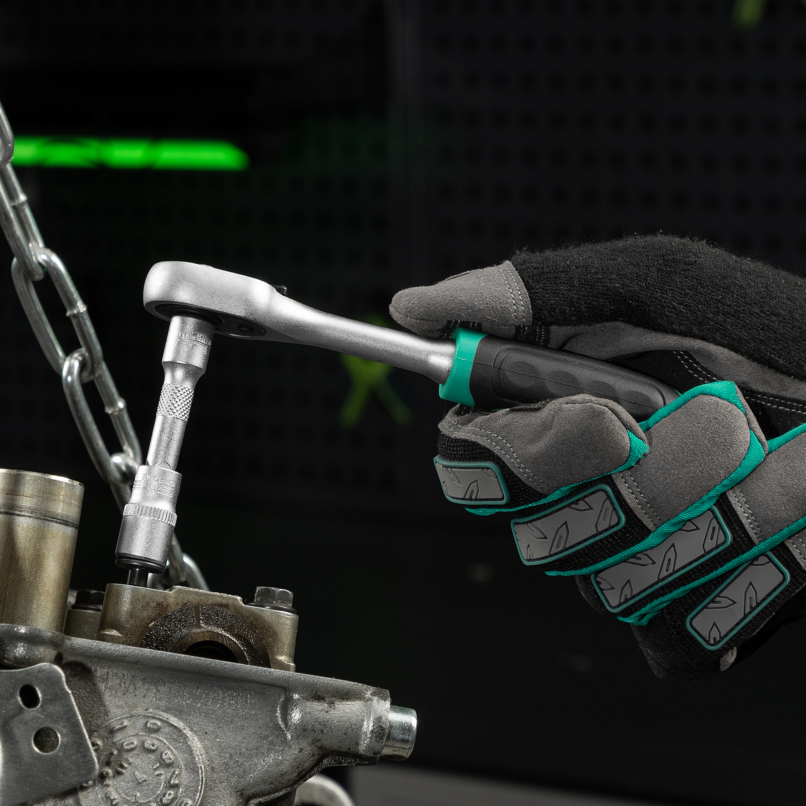 - Защита от разрушения — антикоррозийное покрытие "матовый хром" предотвращает появление ржавчины, а рукоятка трещотки из полипропилена и резины устойчива к воздействию бензина и масла.