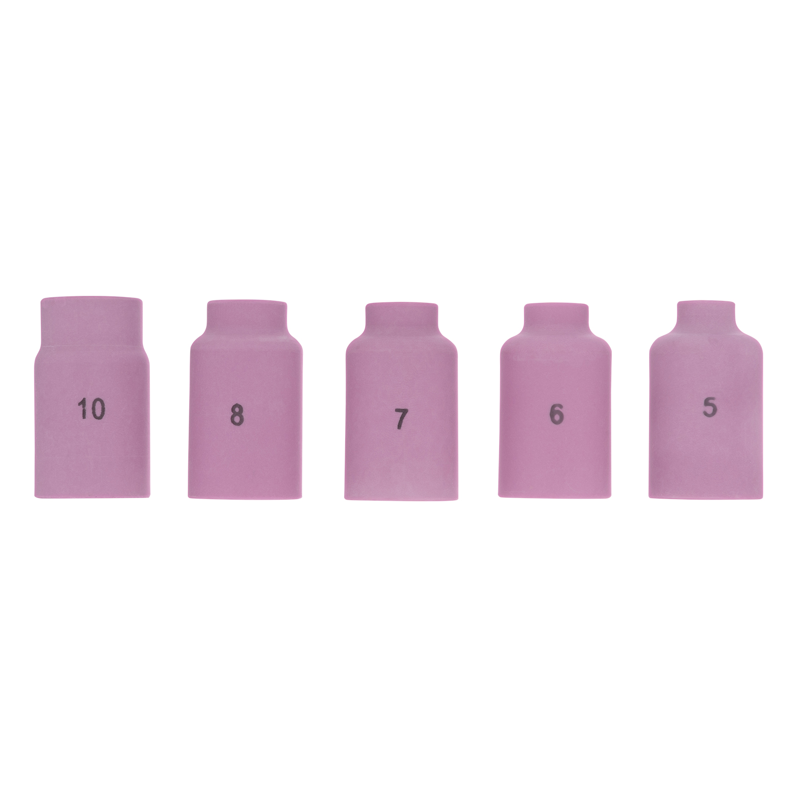Набор керамических сопел Denzel 93659 для газовой линзы включает в себя оснастку № 5, 6, 7, 8, 10, предназначенную для формирования потока защитного газа во время проведения сварочных работ. Предотвращает поступление кислорода к свариваемому материалу и повышает качество сварного шва. Сопла совместимы с TIG-горелками Denzel 93643, 93644, а также с моделями других торговых марок с аналогичным посадочным разъемом.