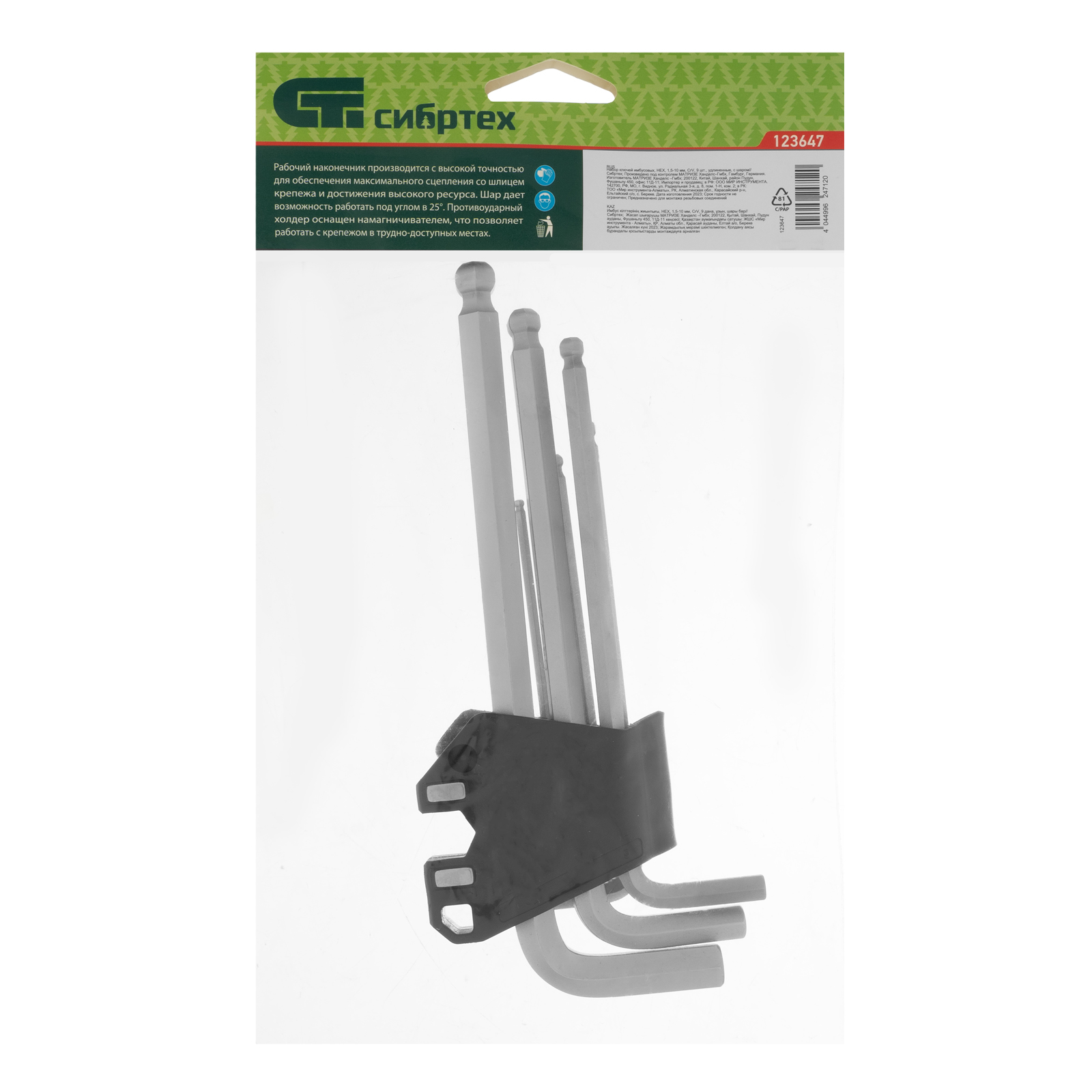 Набор Сибртех 123647 включает в себя 9 удлиненных имбусовых ключей из стали CrV размером 1,5-10 мм, с шаром, предназначенных для закручивания и откручивания крепежа со шлицем типа HEX. Шарообразные наконечники можно вставлять в головку крепежа под углом до 25°, удлиненные профили позволяют увеличить прикладываемое усилие. Набор пригодится для ремонта велосипедов, сборки мебели, установки и регулировки пластиковых окон.