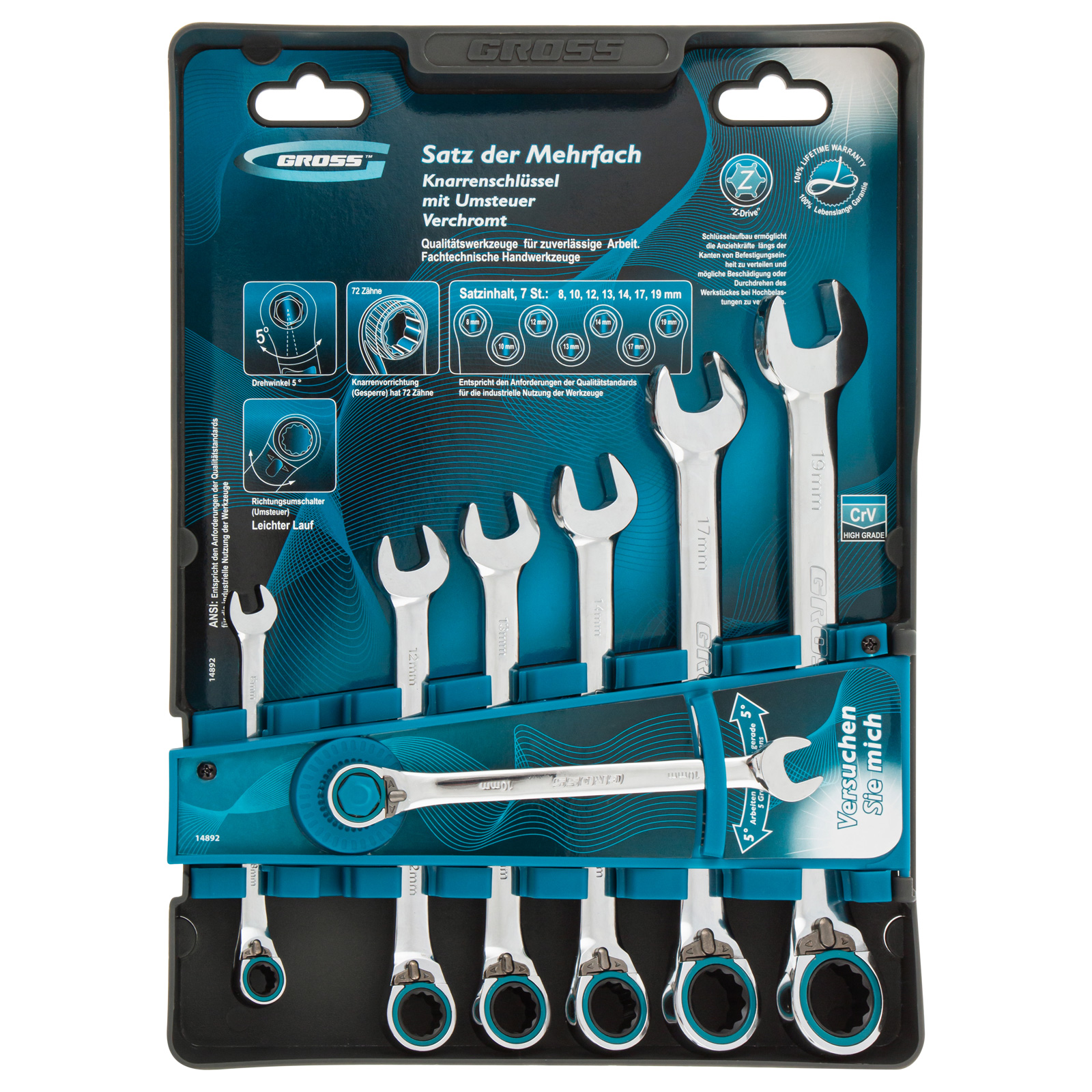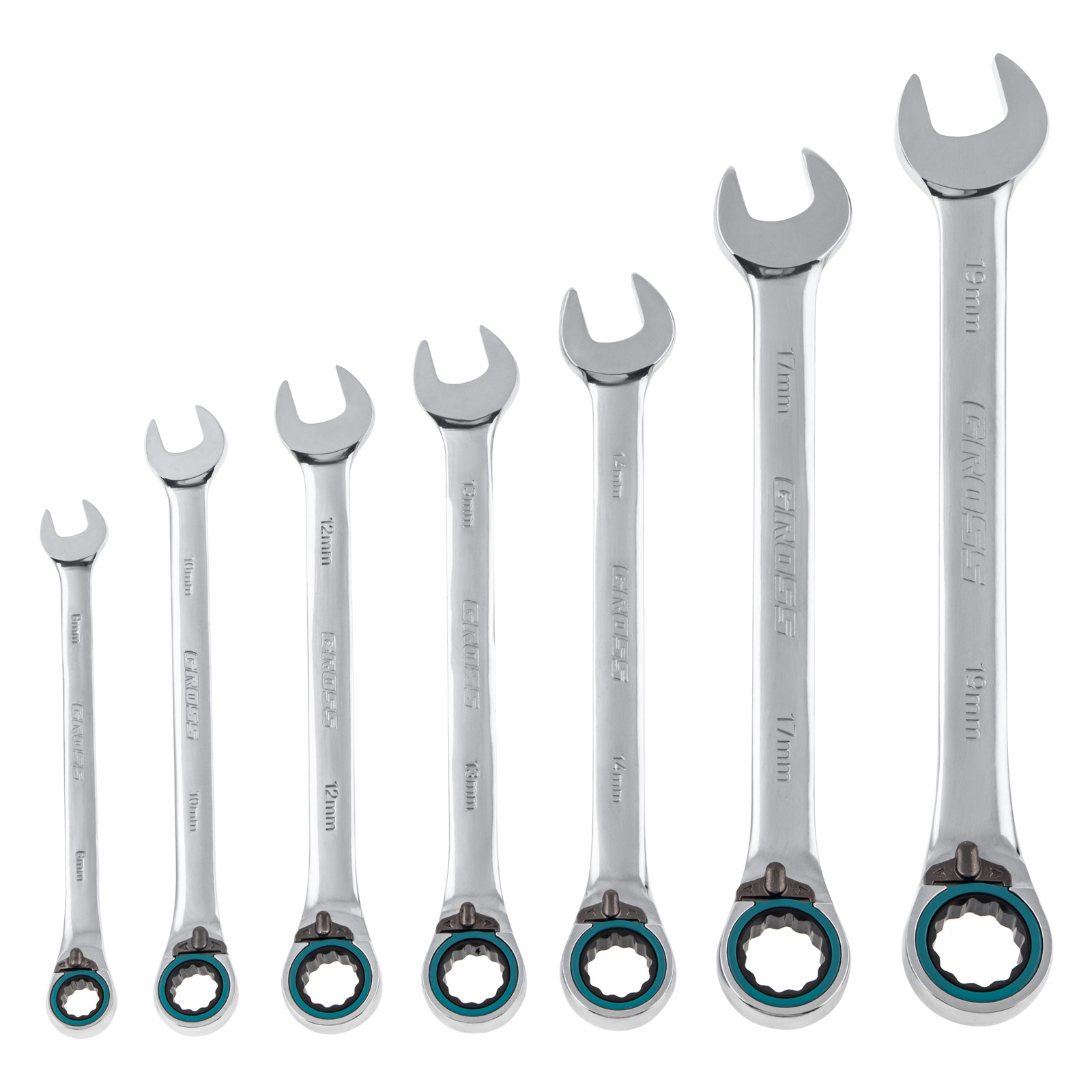 Набор ключей комбинированных с трещоткой, 8-19 мм, 7 шт, реверсивные, CrV Gross в Уфе