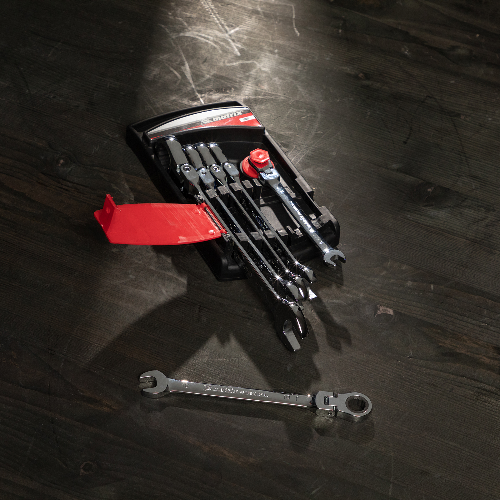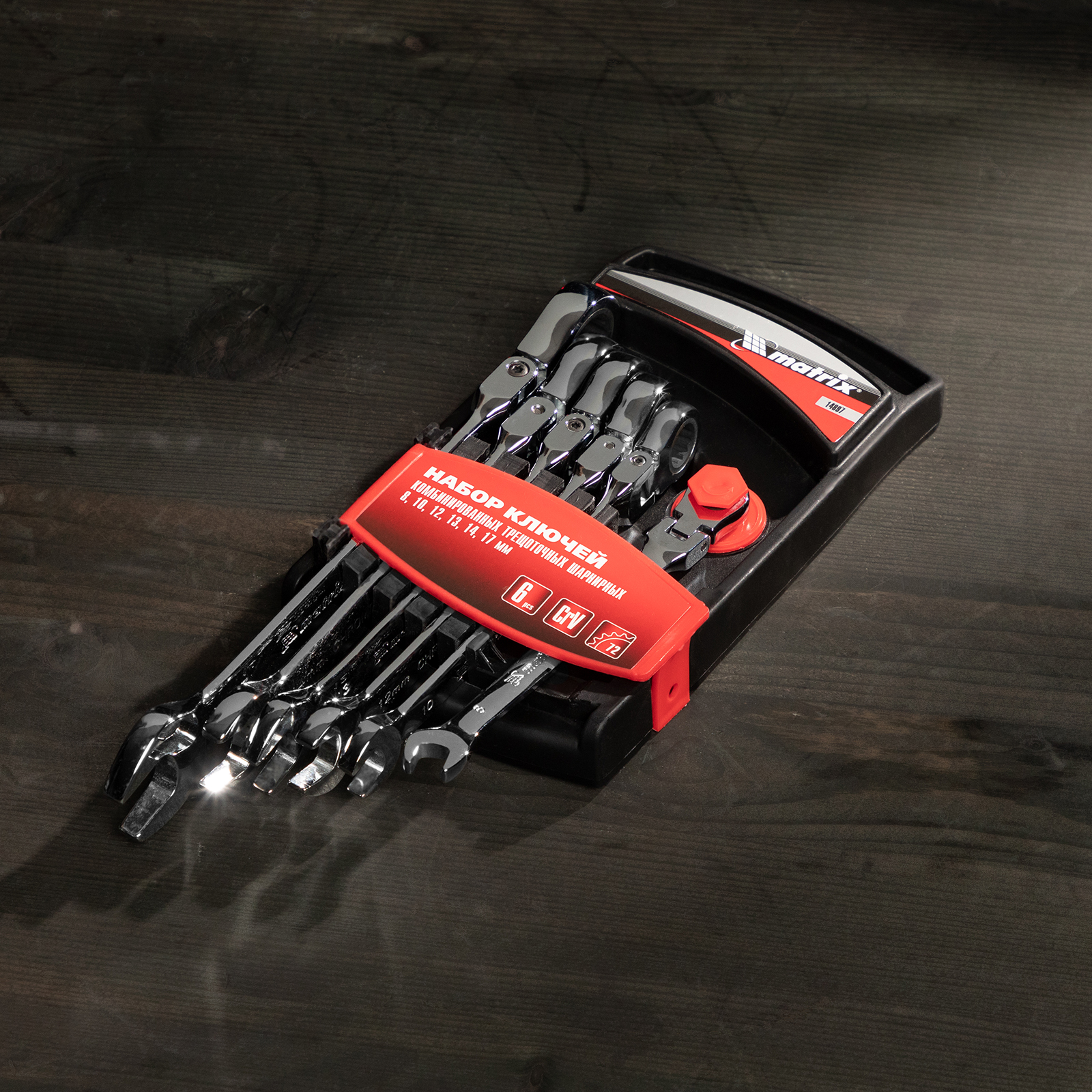 Набор из 6 комбинированных трещоточных шарнирных ключей Matrix 14897 пригодится мастерам и автолюбителям для фиксации и раскручивания крепежных элементов. Трещоточный механизм повышает скорость работы и легко справляется даже с закисшим крепежом.