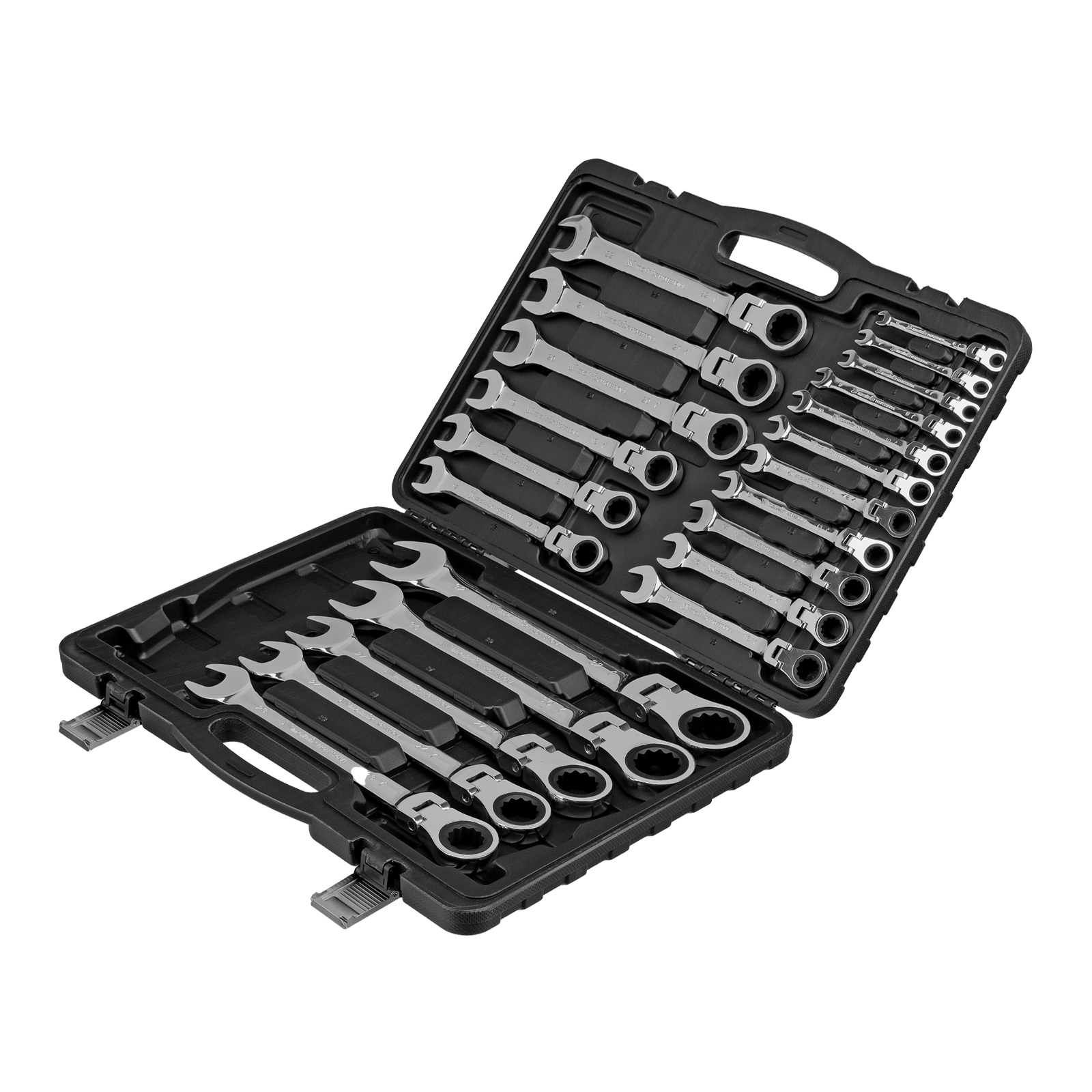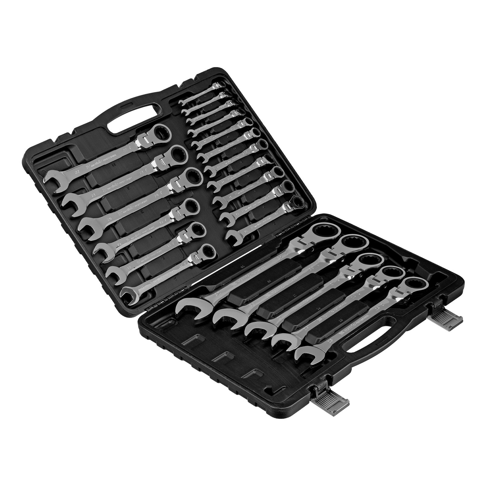 Набор ключей комбинированных, трещоточных шарнирных - 22 шт, типоразмеры - 6, 7, 8, 9, 10, 11, 12, 13, 14, 15, 16, 17, 18, 19, 20, 21, 22, 23, 24, 27, 30, 32 |