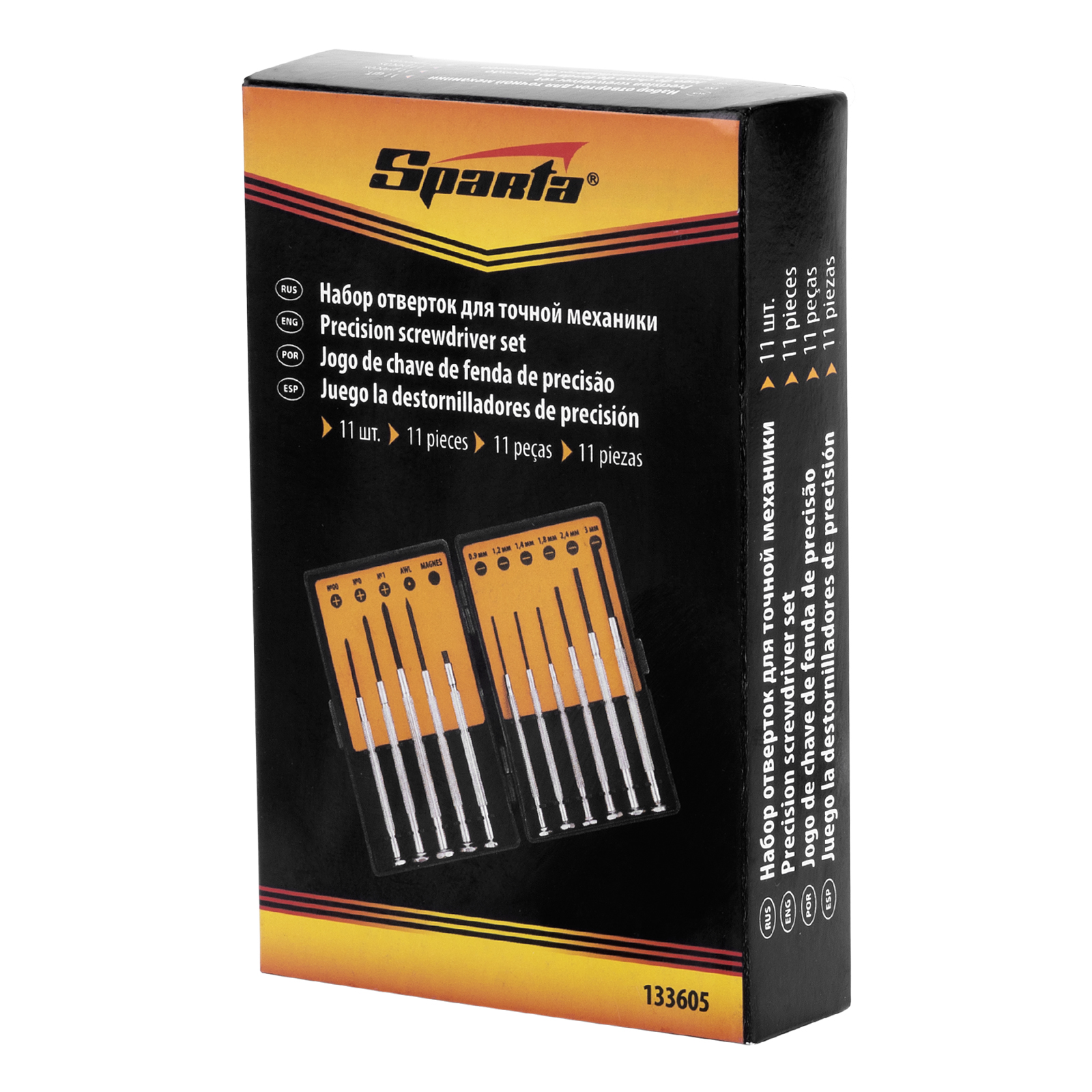 Набор отверток Sparta 133605, 11 предметов, используется для точной механики при осуществлении монтажа/демонтажа микровинтов со шлицами SL и PH. Он рассчитан на несложные бытовые работы, может применяться в частной мастерской. С помощью набора легко ремонтировать мелкие бытовые приборы, очки, часы и т.д.
