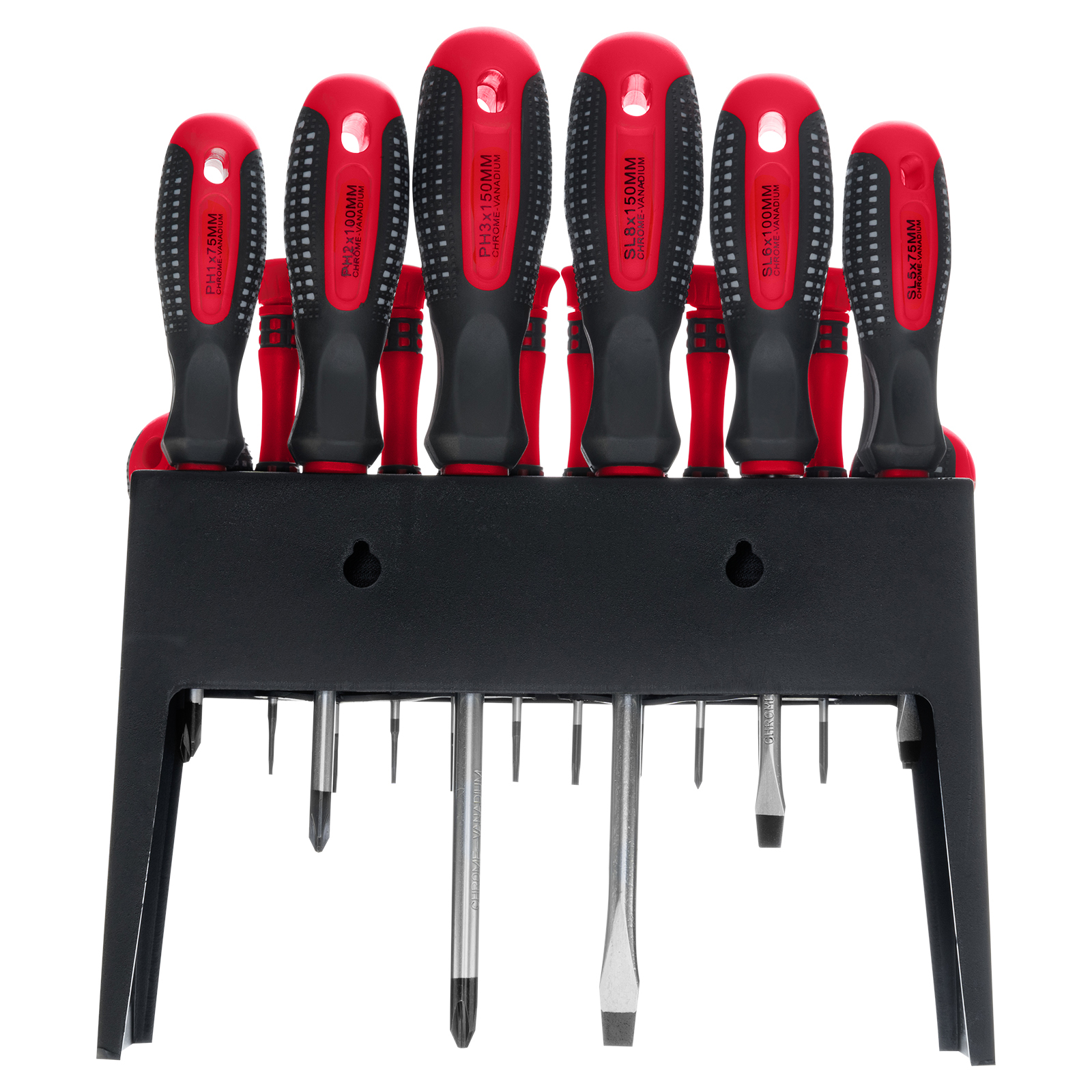 Отвертки стандартные: РН1х75 мм, РН2х38 мм, РН2х100 мм, РН3х150 мм, SL5x75 мм, SL6x38 мм, SL6x100 мм, SL8x150 мм - 8 штОтвертки для точных работ, длина стержня 40 мм: РН00, РН0, SL25, SL3, T5, T6, T7, T8, T9, T10 - 10 штПодставка для отверток - 1 шт |