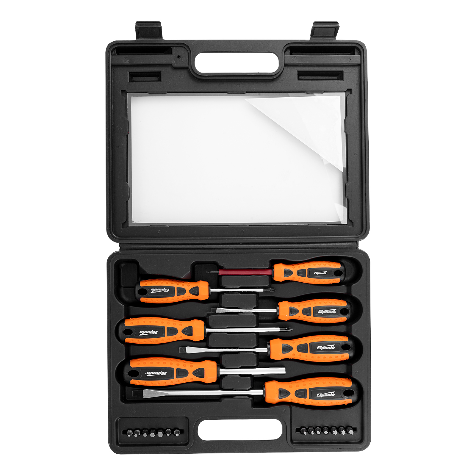 Пластиковый кейс - 1 штОтвертки: РН1х75 мм, РН2х100, SL3х75, SL5x75, SL6x100, SL8x150 - 6 штБиты 25 мм: Н2, Н3, Н4, Н5, Н6, Т10, Т15, Т20, Т25, Т27, Т30, Т35, Т40 - 13 шт |