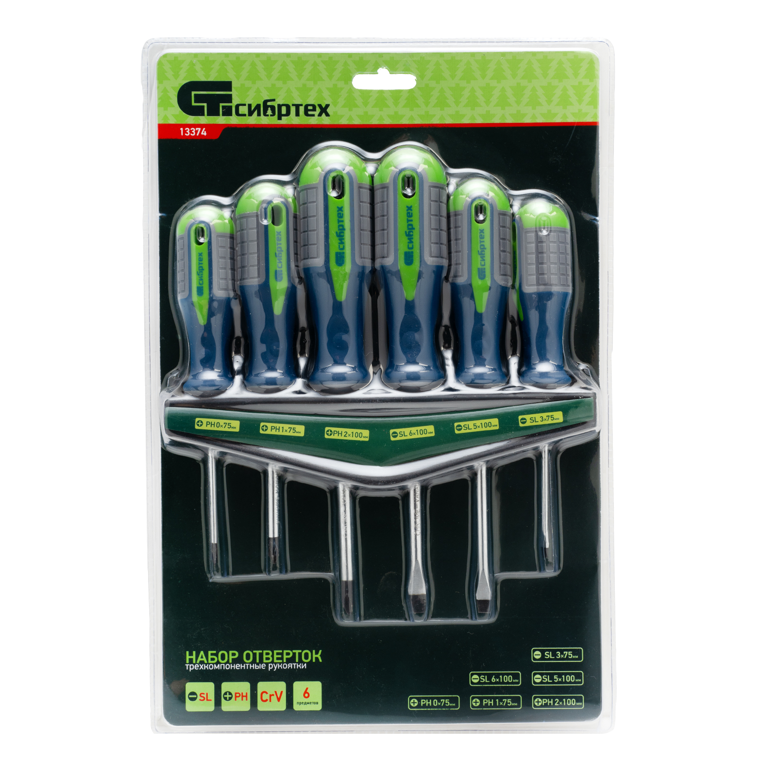 Набор отверток Сибртех 13374 включает в себя 6 предметов из стали CrV с трехкомпонентными рукоятками, которые будут полезны мастерам при осуществлении несложных ремонтных и монтажных работ. С их помощью можно производить монтаж/демонтаж резьбового крепежа с профилем SL и PH. Длина стержней отверток составляет 75-100 мм для удобства работы с крепежом на поверхностях и в небольших углублениях.