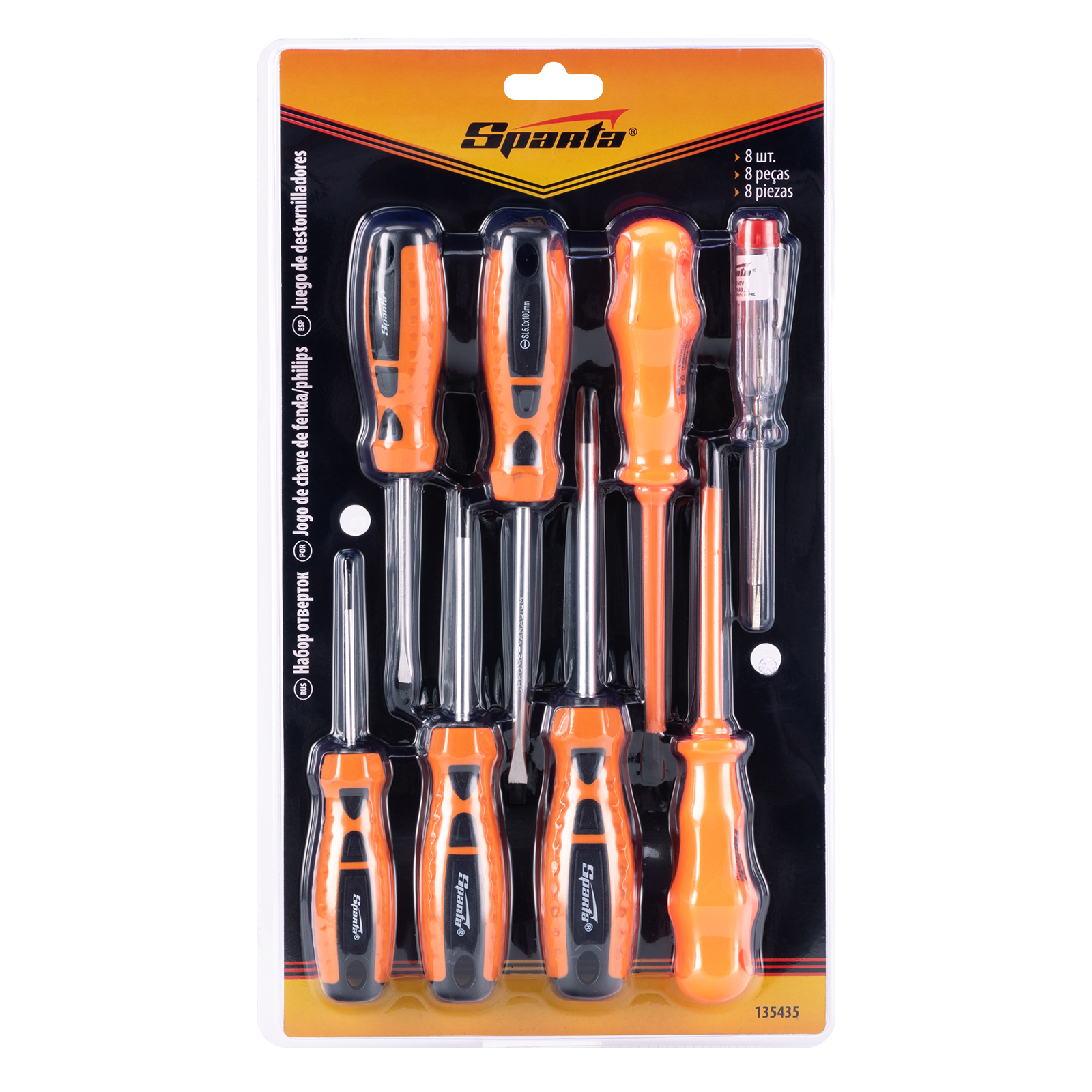 Набор отверток Sparta 135435 включает 8 предметов: 5 отверток для монтажа/демонтажа крепежных элементов с профилем PH и SL, 2 диэлектрические отвертки и электрический пробник на 220 В. Он пригодится для ремонта и обслуживания электрооборудования в быту. Важно — техника безопасности исключает проведение работ под напряжением!