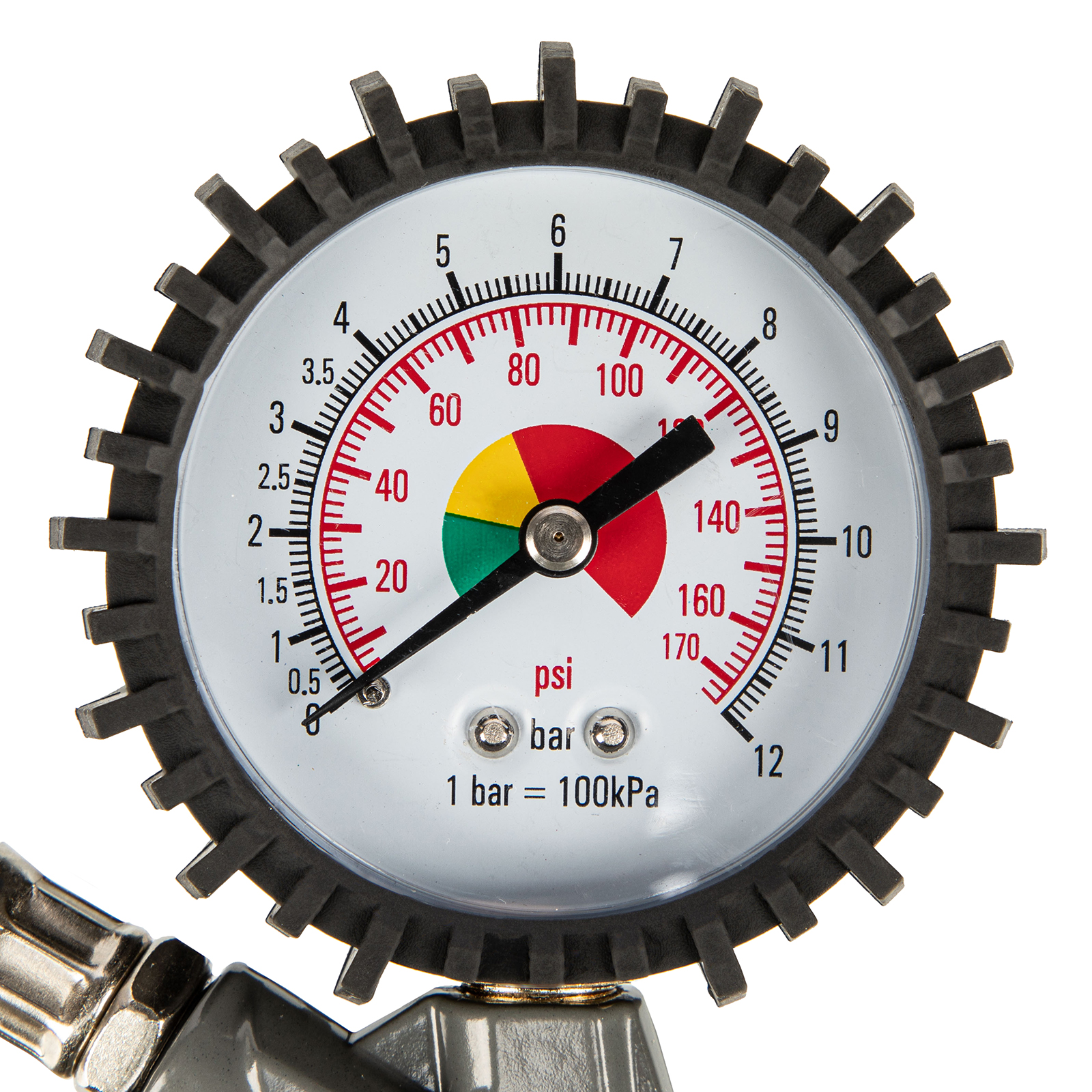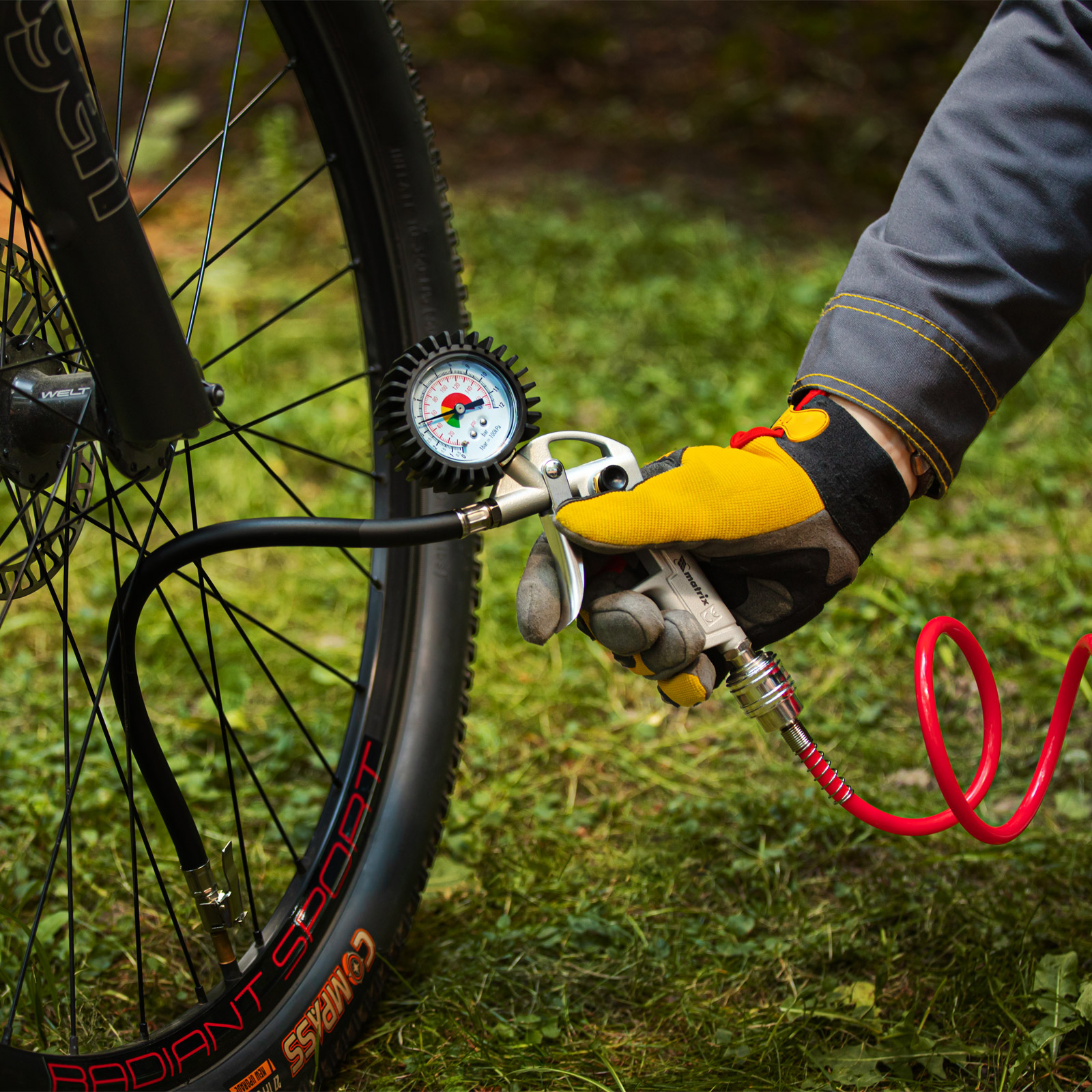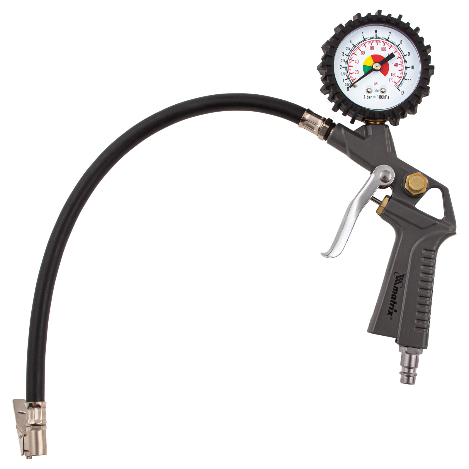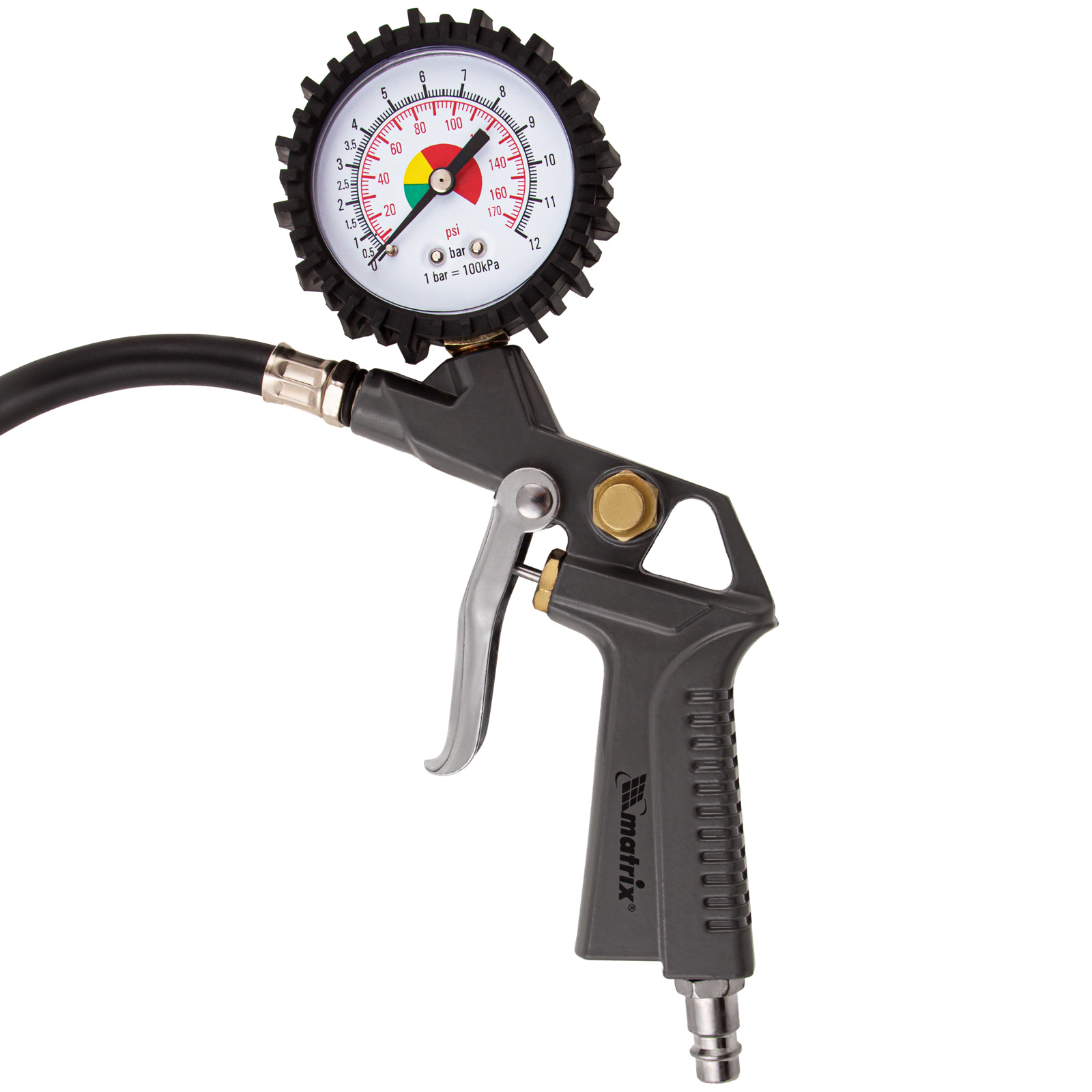 - Контроль давления — пистолет подкачки шин оснащен точным механическим манометром.