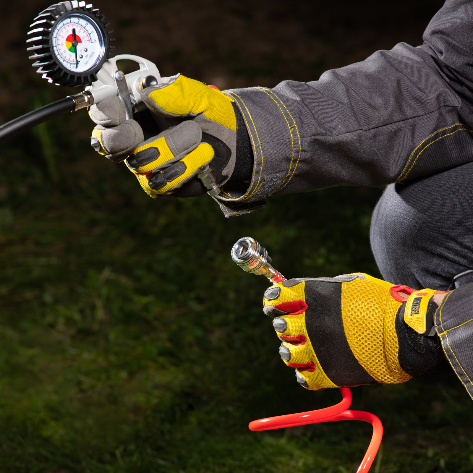 - Легкое накачивание шин на спаренных колесах — гибкий шланг на пистолете подкачки упрощает работу в труднодоступных местах.