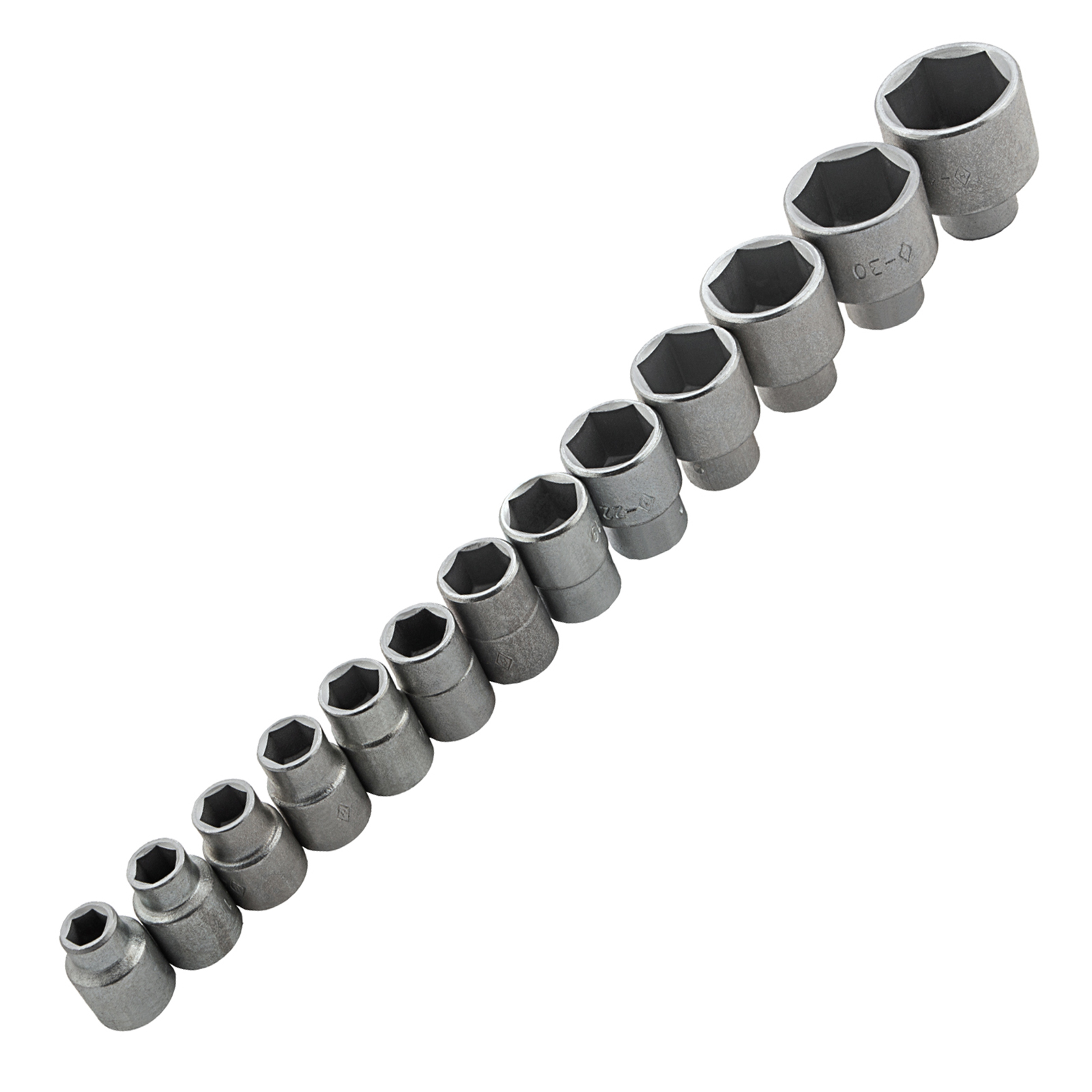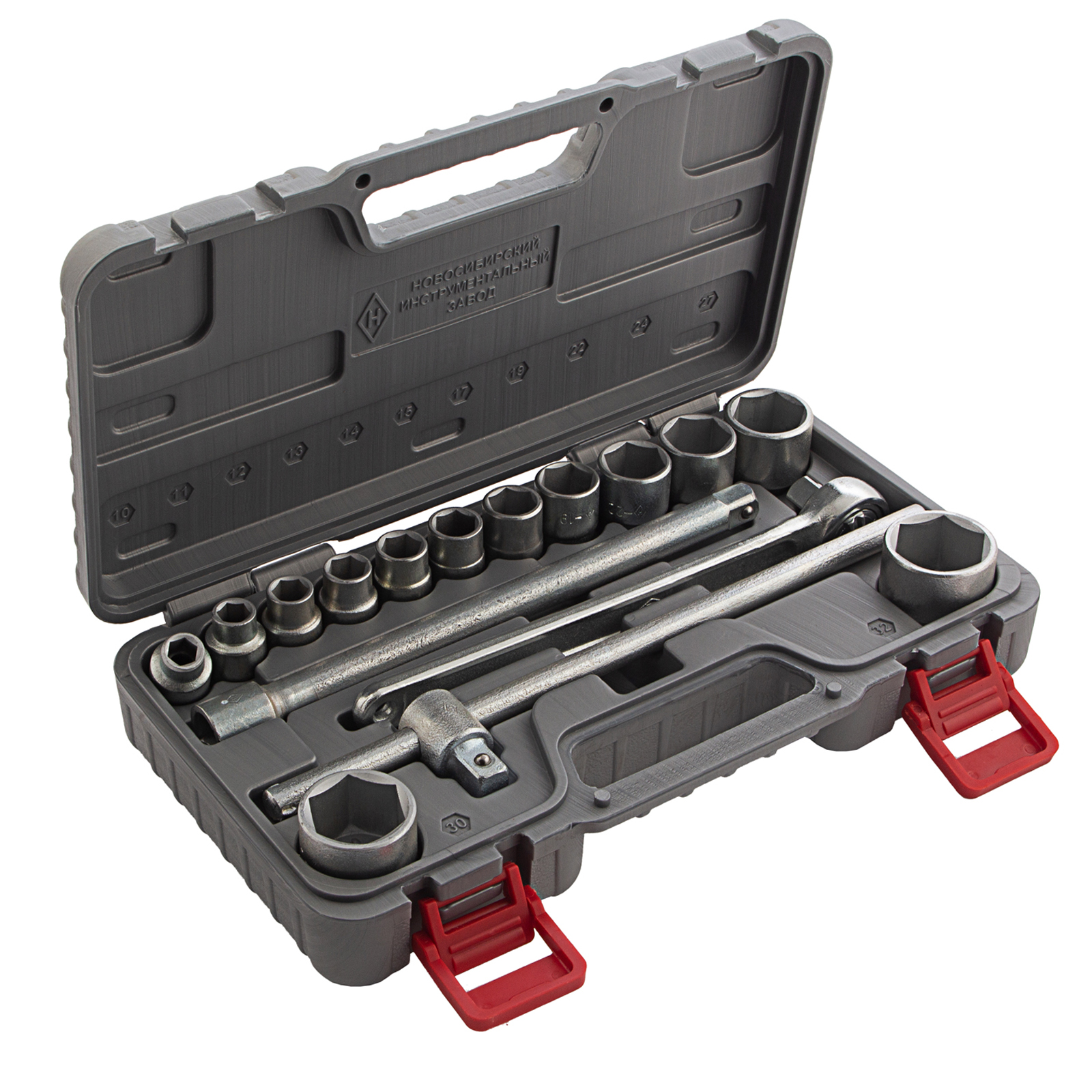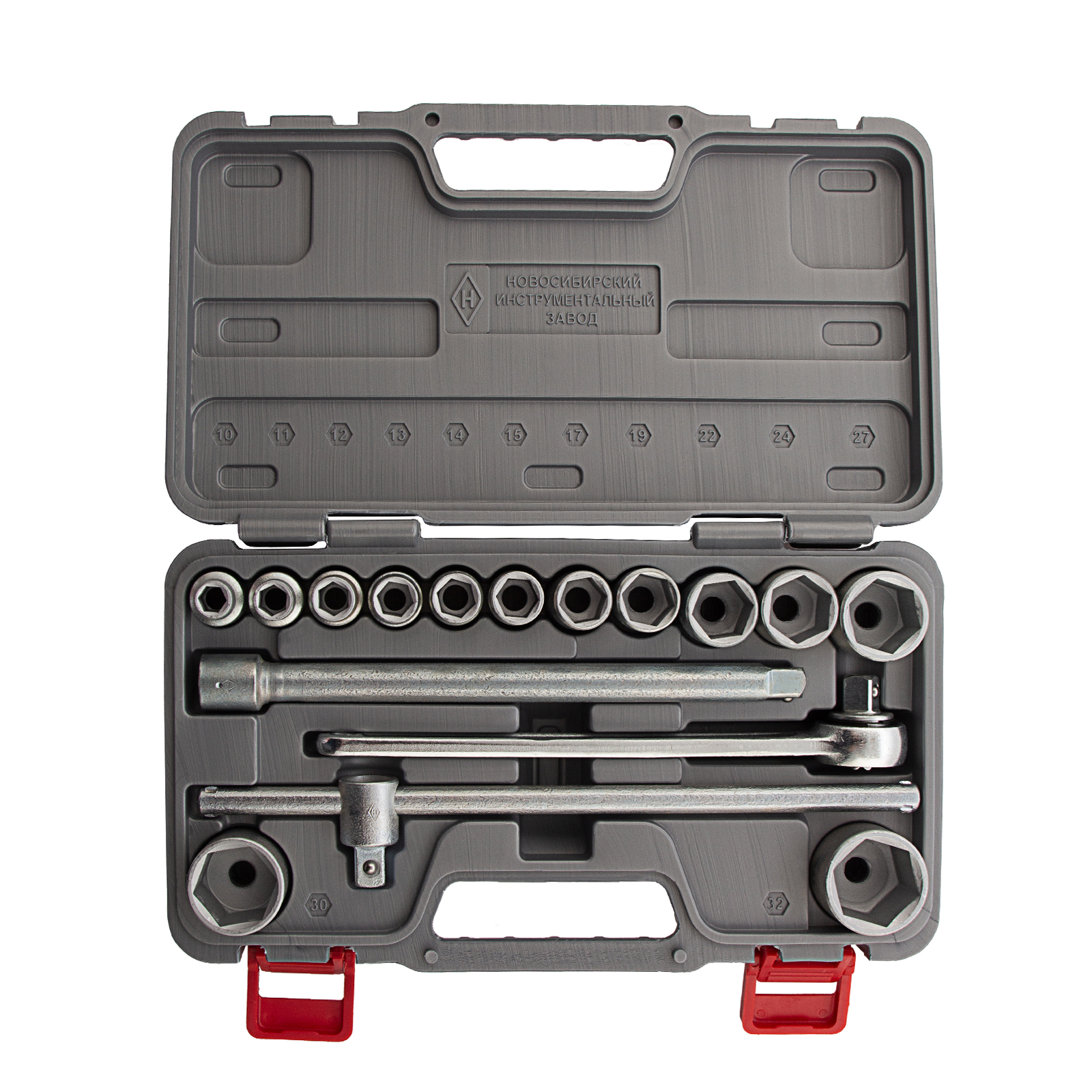 Головки 10, 11, 12, 13, 14, 15, 17, 19, 22, 24, 27, 30, 32 - 13 штКлюч трещотка - 1 штВороток Т-образный - 1 штУдлинитель - 1 штКейс - 1 штТрещотка - 1 шт |