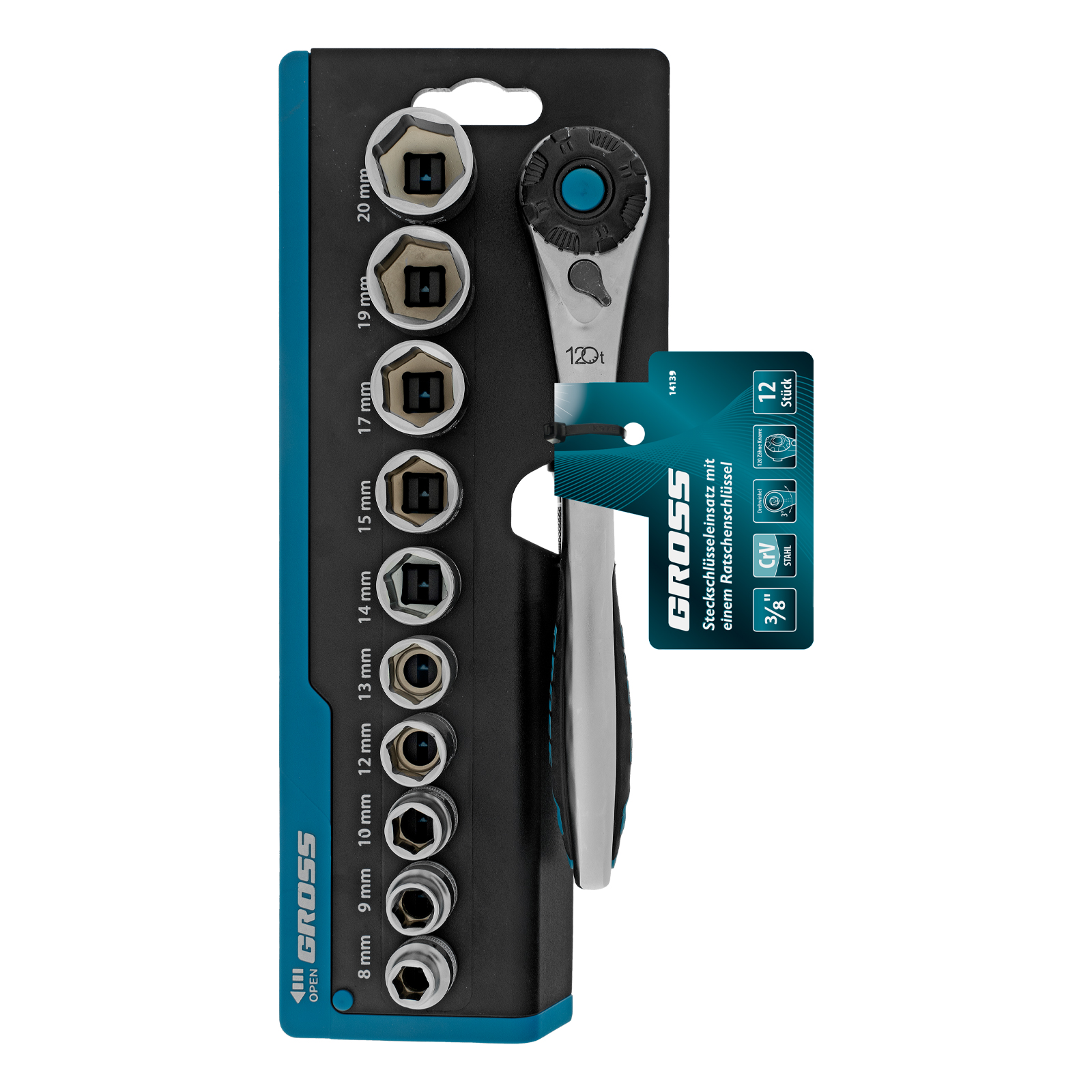 Набор торцевых головок, трещотка 120 зубьев, 3/8", CrV, 12 предметов Gross в Уфе