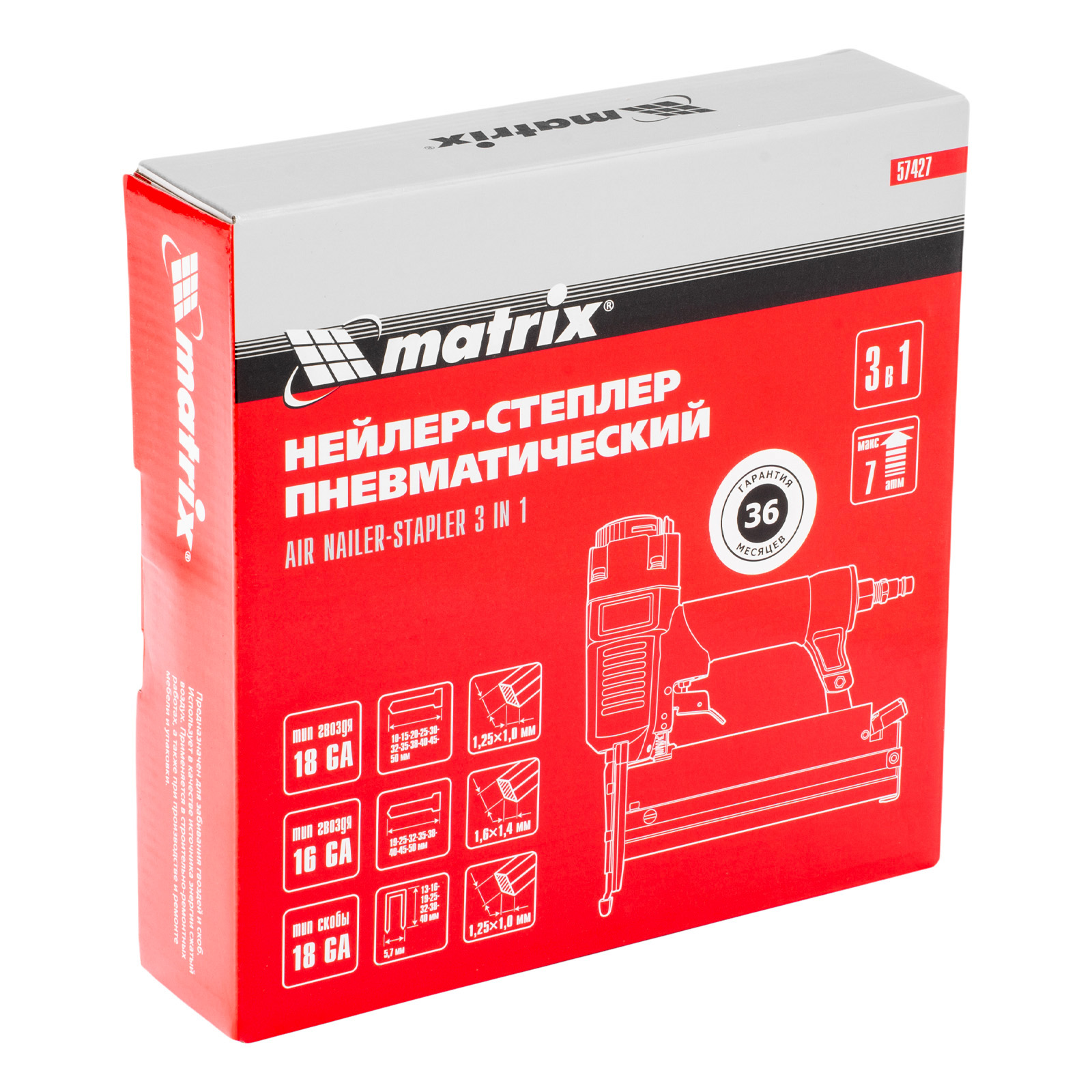 Пневматический нейлер-степлер 3 в 1 Matrix 57427 способен забивать на регулируемую глубину скобы 18 GA и гвозди 18GA и 16GA. Используется для фиксации паркетной доски, фанеры, ДВП, шифера, гипсокартона, ткани и бумаги. Пригодится во время ремонта, а также для сборки мебели и отделочных работ. Расход воздуха составляет 107 л/мин, поэтому нейлер-степлер можно подключать к любому типу компрессоров.