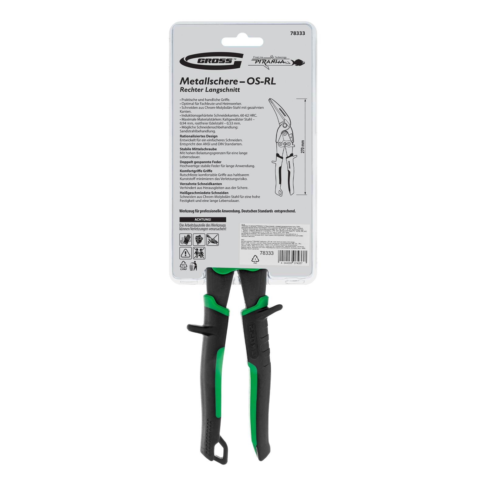 Ножницы по металлу Gross PIRANHA 78333 длиной 270 мм, из стали CrMo, с двухкомпонентными рукоятками, выполняют прямой и правый проходной рез по листовому металлу. Режут не только цветные металлы, но и стали: холоднокатаную толщиной до 0,94 мм и нержавеющую толщиной до 0,53 мм. Двойной рычажный механизм снижает нагрузку на руку. Ножницы рекомендованы для выполнения профессиональных слесарных работ.