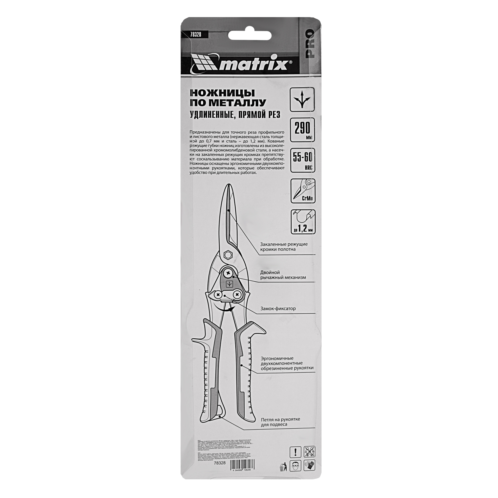Удлиненные ножницы по металлу Matrix PRO 78328 длиной 290 мм, из стали CrMo, с двухкомпонентными обрезиненными рукоятками, предназначены для прямого реза листовых и профильных металлических заготовок, в том числе стали толщиной до 1,2 мм и «нержавейки» толщиной до 0,7 мм. Двойной рычажный механизм позволяет передавать значительное усилие, облегчая резку материала большой толщины. Для удобства работы на корпусе имеется маркировка с указанием направления резания. Ножницы будут полезны в профессиональной и домашней мастерской.