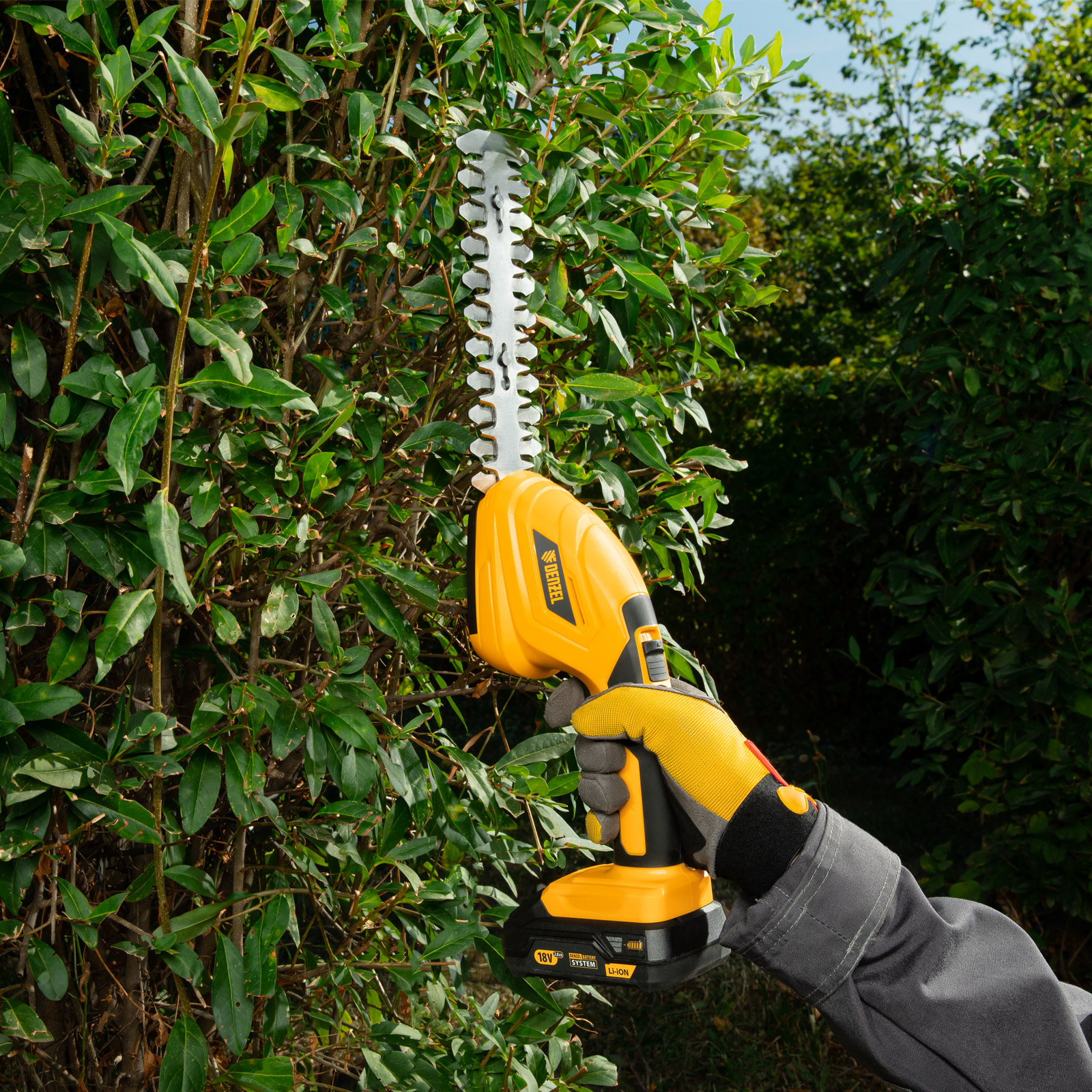 - Полный комплект поставки — аккумулятор и зарядное устройство прилагаются к ножницам-кусторезу.
