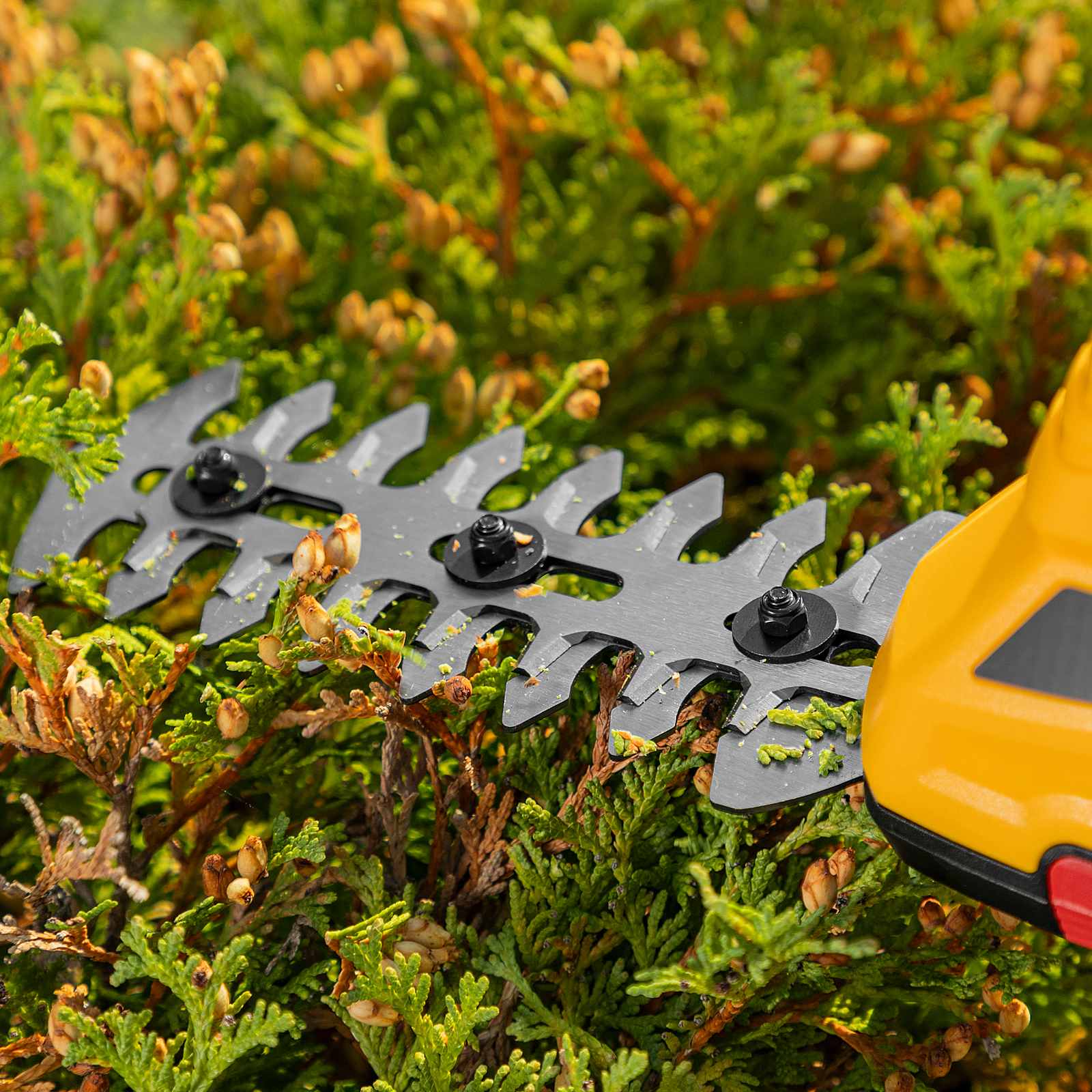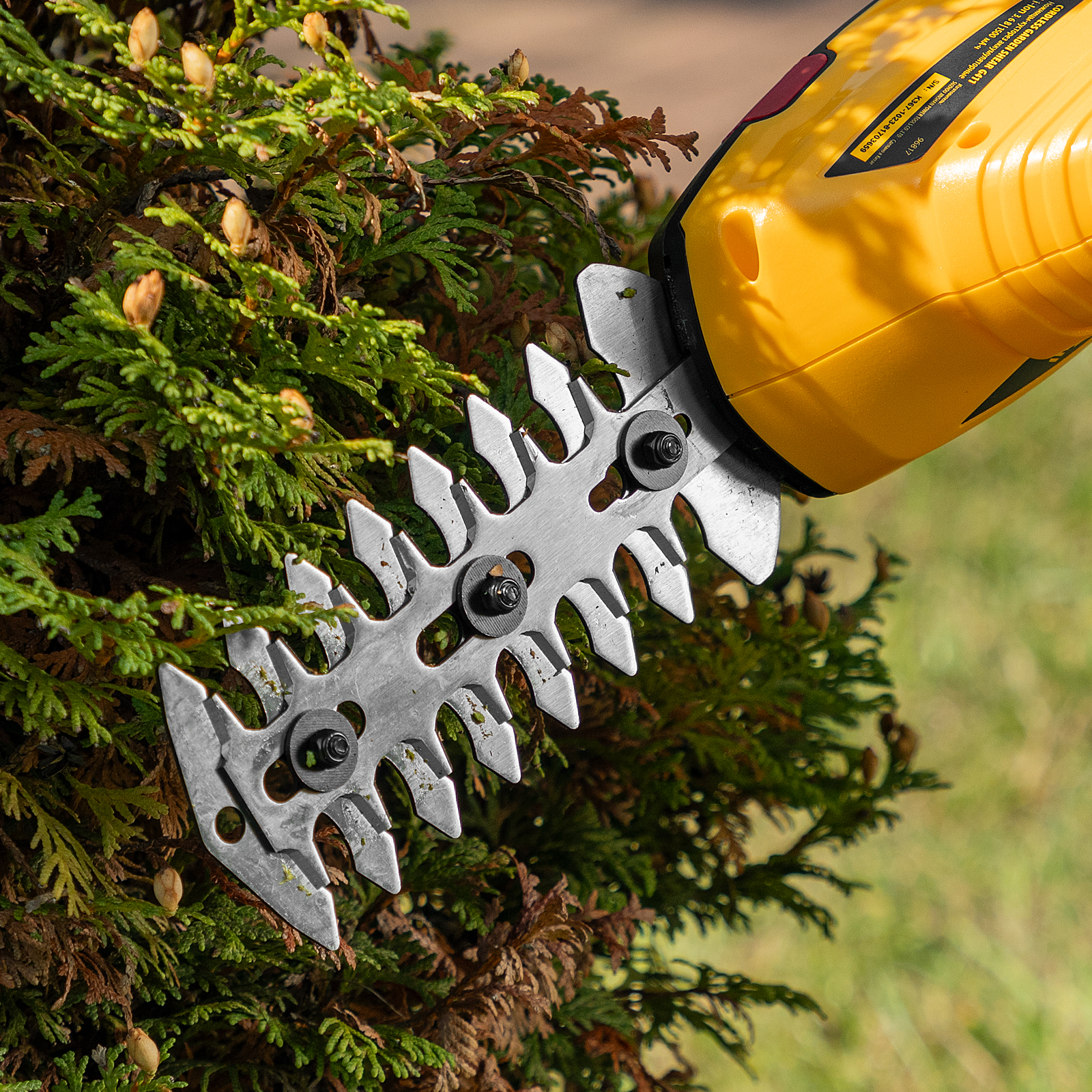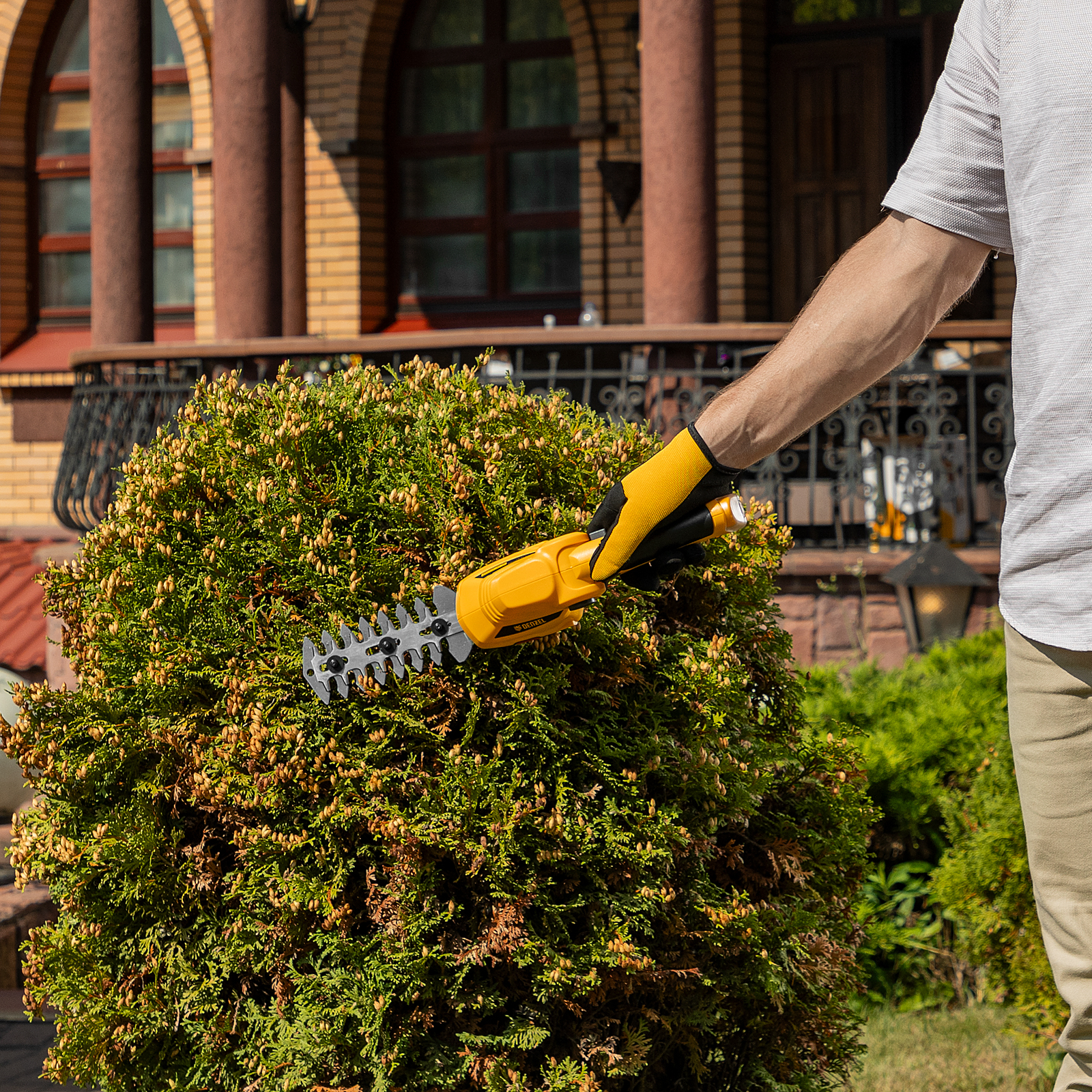 - Долговечность — медная обмотка двигателя устойчива к перегреву и обеспечивает стабильную работу ножниц-кустореза даже при высоких нагрузках.
