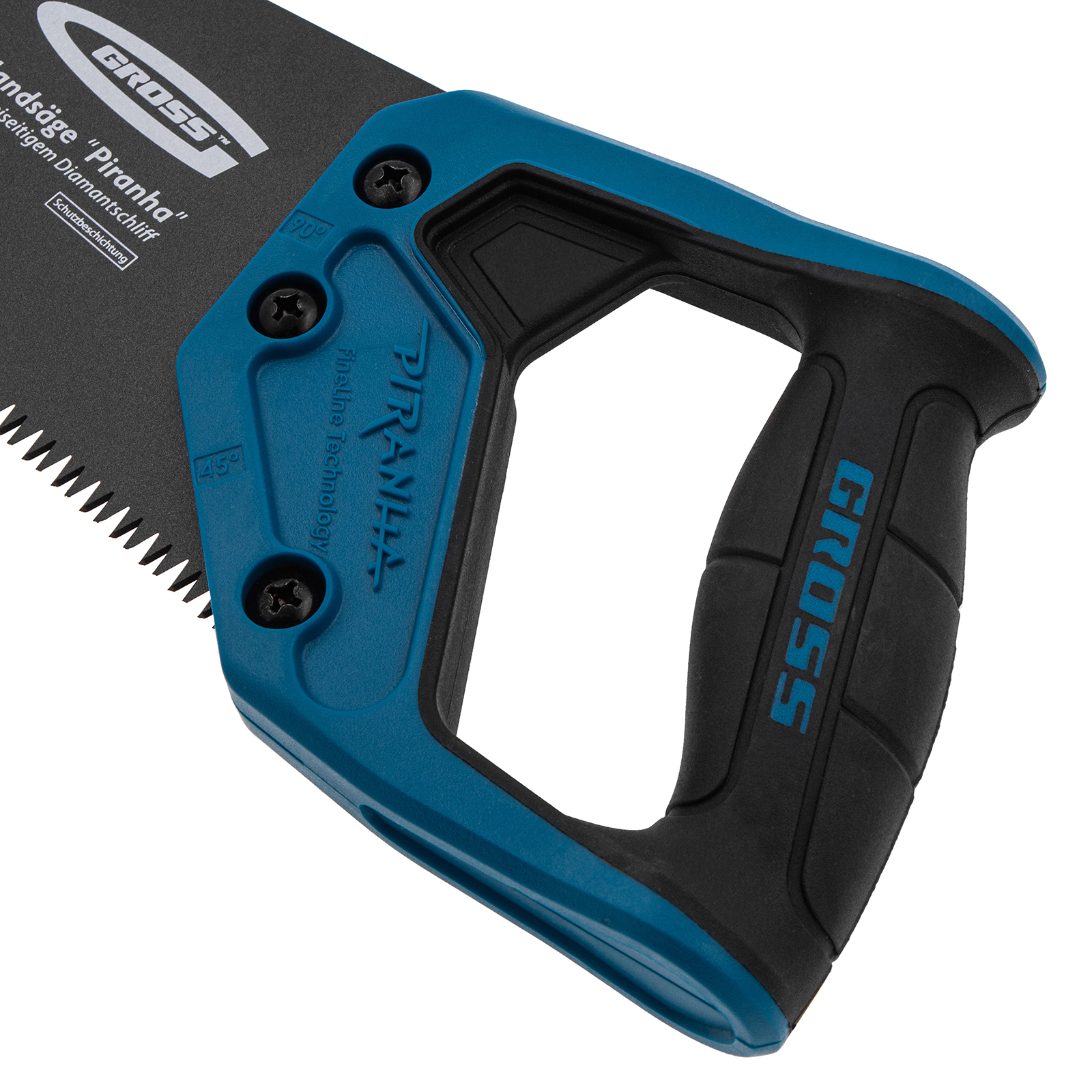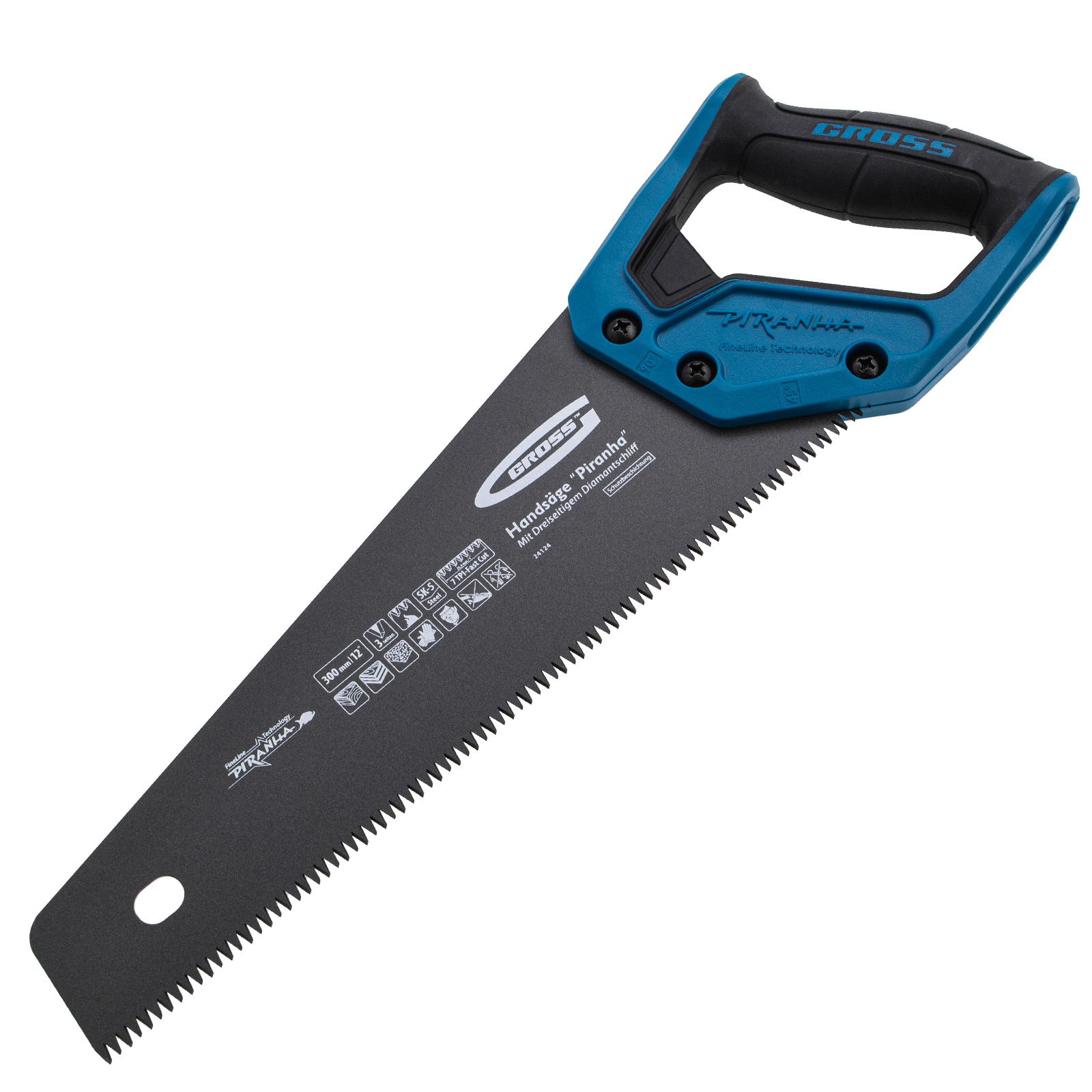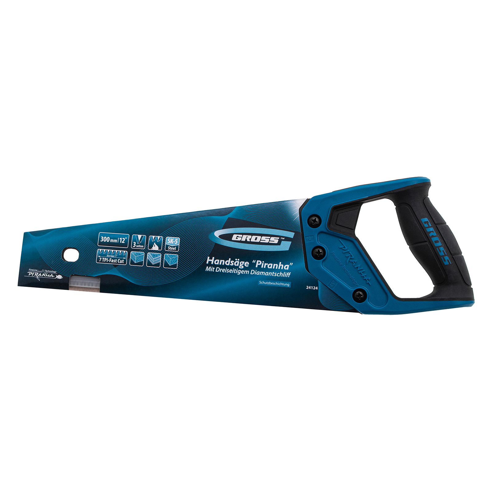 Ножовка по дереву Gross PIRANHA 24124 с полотном длиной 300 мм, калеными зубьями с 3D-заточкой и шагом 7 TPI, с тефлоновым покрытием полотна и 2-компонентной рукояткой, используется для продольного и поперечного распиливания древесины различных пород, МДФ, ДСП, ДВП, ламината, а также пенополистирола, полиуретана и других синтетических материалов. Рабочая часть состоит из крупных зубьев, поэтому ножовка подходит для решения широкого спектра задач. Трехгранная заточка зубьев увеличивает производительность инструмента без потери качества распиловки. Ножовка предназначена для столярных работ.