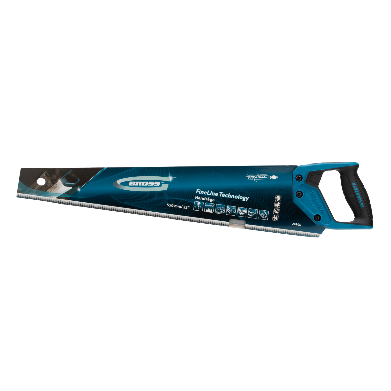 Ножовка по дереву Gross PIRANHA 24105 с полотном длиной 550 мм, калеными зубьями с 3D-заточкой и шагом 11-12 TPI, с двухкомпонентной рукояткой, предназначена для распиловки заготовок из древесины, ДСП, ДВП, МДФ и ламината, а также из пластических материалов, таких как пенополистирол и полиуретан. Может производить продольный и поперечный распил. Мелкие зубья с шагом 11-12 TPI позволяют выполнять точный и чистый рез. Ножовка обладает высокой производительностью благодаря трехгранной заточке зубьев. Инструмент используется в столярном деле.