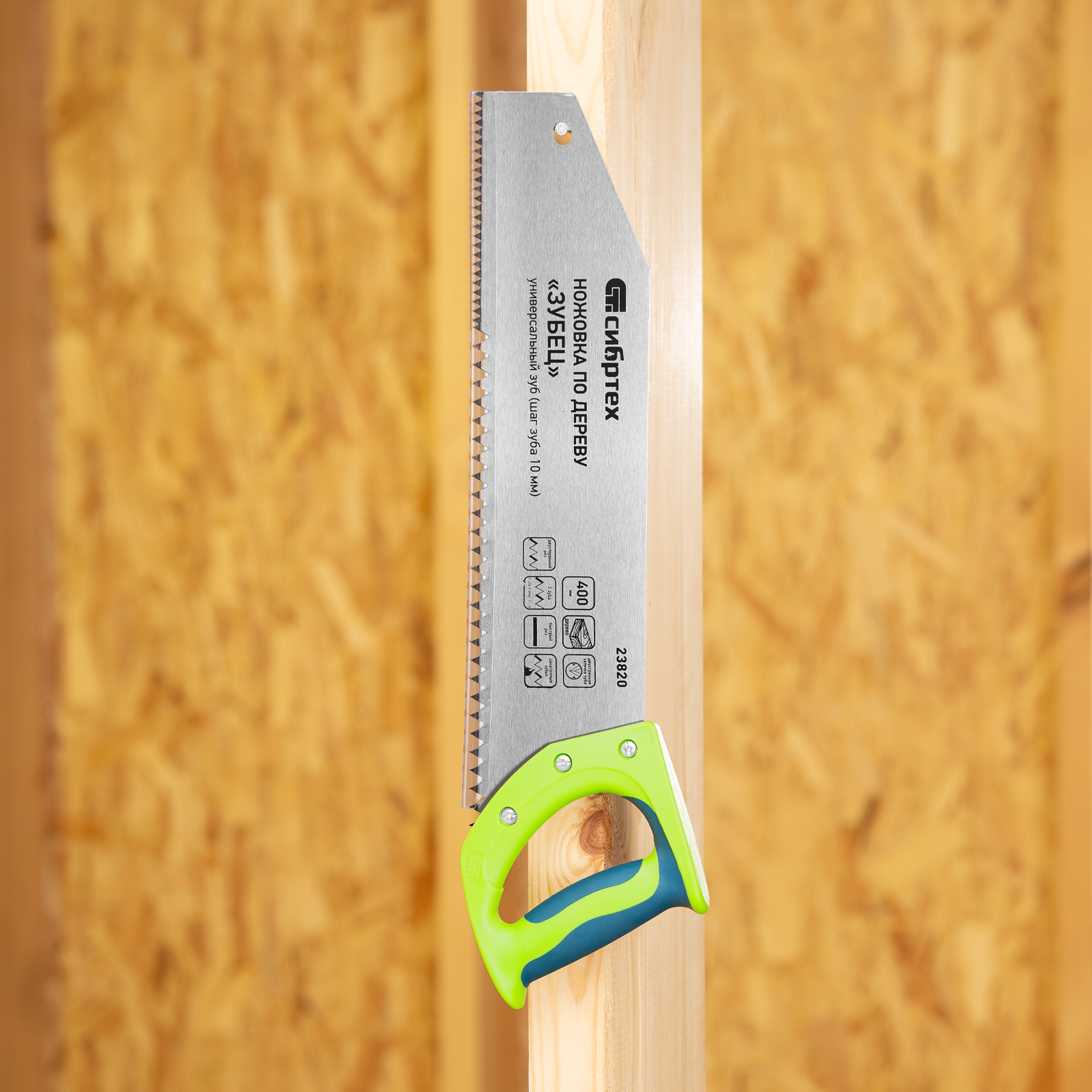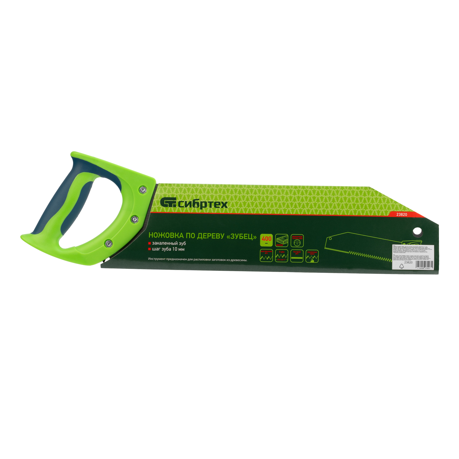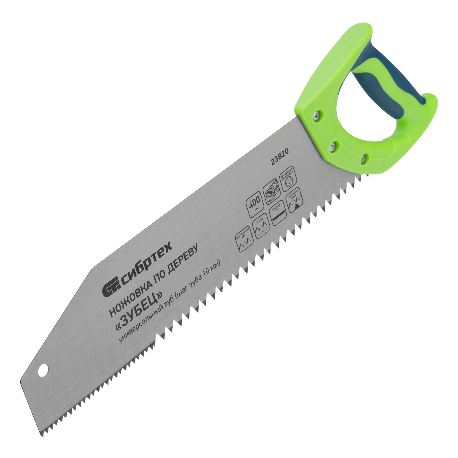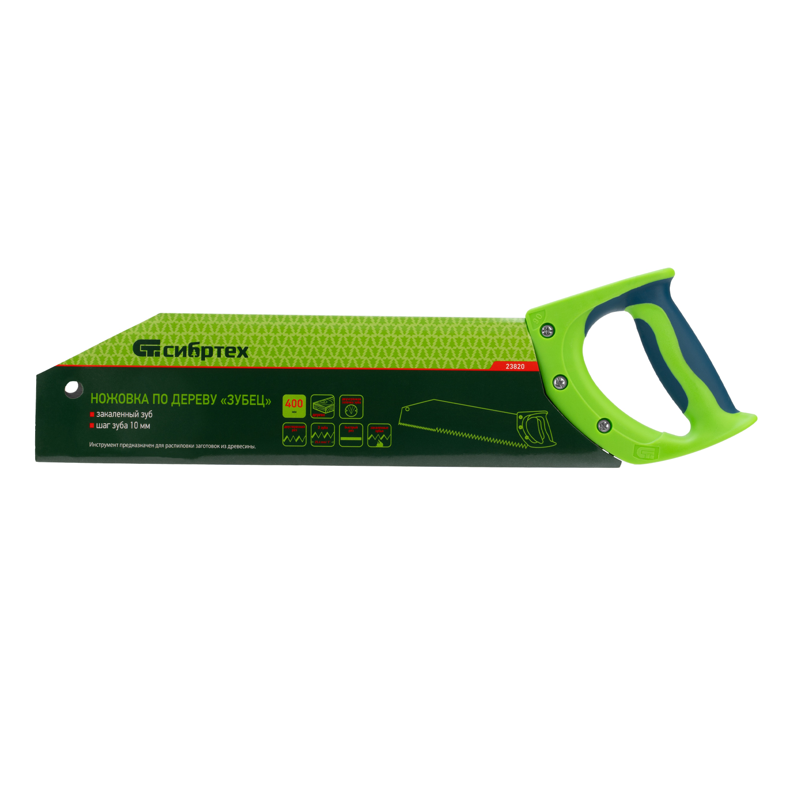 Ножовка по дереву Сибртех «Зубец» 23820 с полотном длиной 400 м, с калеными зубьями с шагом 10 мм и 2D-заточкой, с двухкомпонентной рукояткой, используется для продольного и поперечного пиления древесины и ДСП. Рабочая кромка с шагом зубьев 10 мм обеспечивает быстрый двусторонний рез. Возможна заточка режущей части при необходимости. Ножовка применяется для выполнения плотницких работ, пригодится также и в быту.