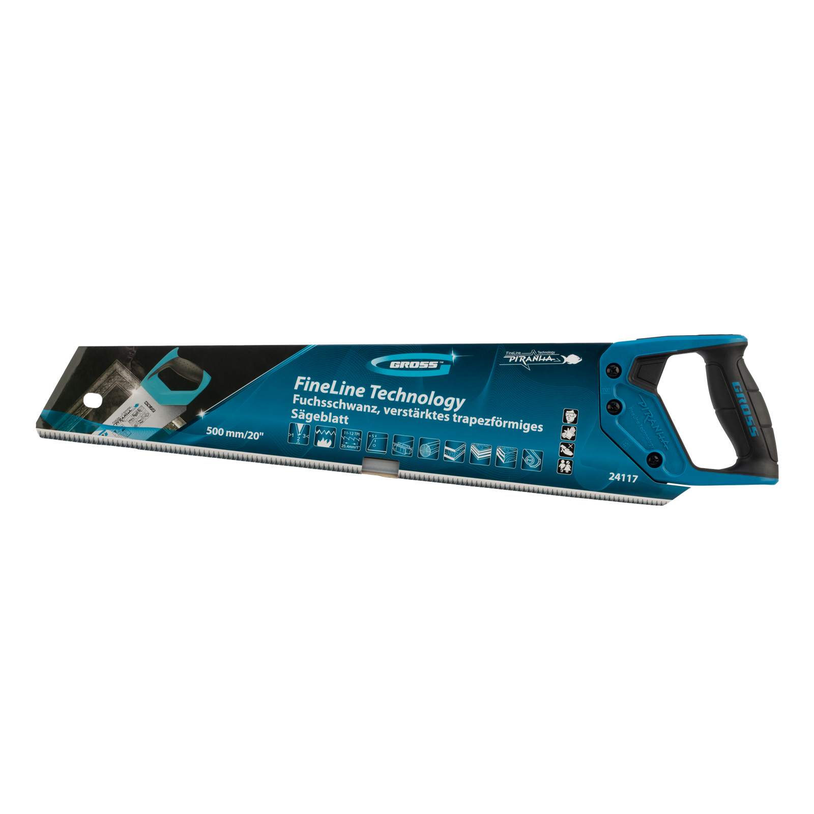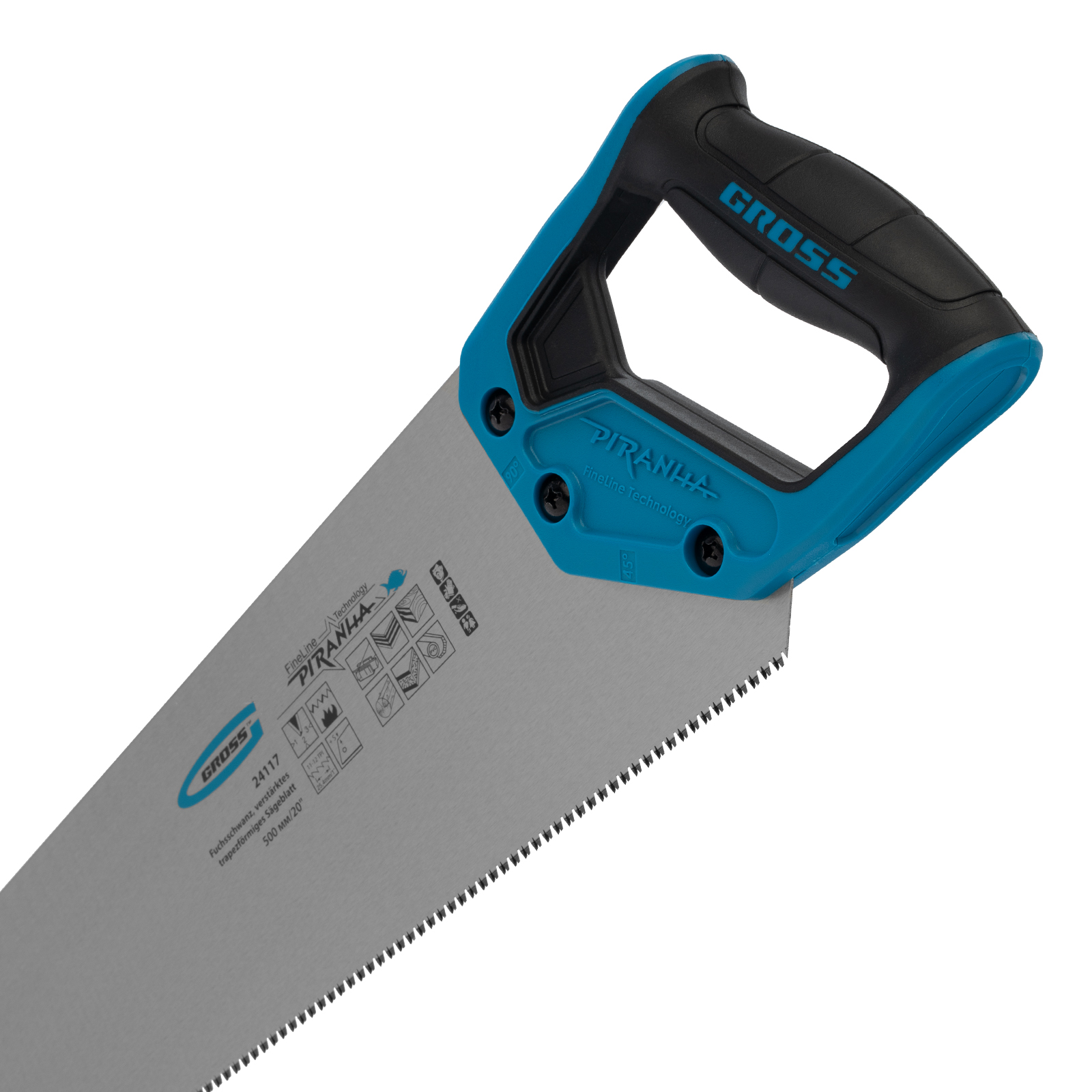 Ножовка по дереву Gross PIRANHA 24117 с усиленным трапециевидным полотном длиной 500 мм, калеными зубьями с 3D-заточкой и шагом 11-12 TPI, с двухкомпонентной рукояткой, используется для выполнения столярных работ. Ей пилят древесину различных пород, МДФ, ДСП, ДВП, ламинат, а также пенополистирол, полиуретан и другие синтетические материалы. Ножовка подходит для продольного и поперечного пиления. Благодаря мелким зубьям с шагом 11-12 TPI выполняет точный и чистый рез. Инструмент рекомендован для профессионального применения, но может использоваться и в быту.