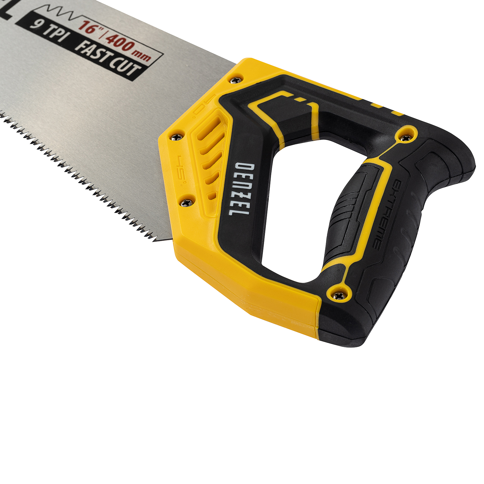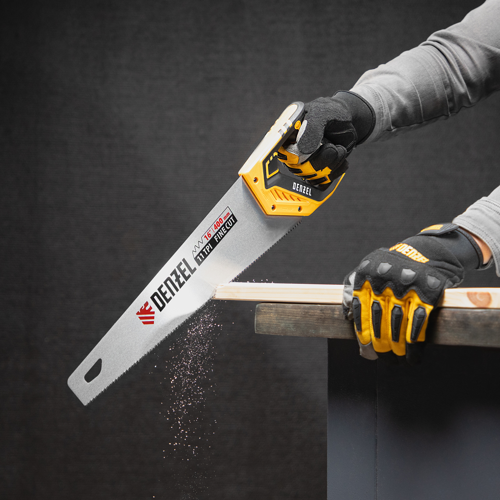 Ножовка по дереву Denzel 24146 длиной 400 мм, с зубьями с шагом 11 TPI и 3D-заточкой, с двухкомпонентной рукояткой, предназначена для продольной и поперечной распиловки заготовок из древесины, ДСП, ДВП, МДФ, ламината, а также из ПВХ (труб, панелей, коробов). Подходит для распиливания плинтусов, вагонки, деревянных профиле й. Мелкие зубья с шагом 11 TPI позволяют выполнять точный и чистый рез. Ножовка используется для проведения столярных работ в мастерской и на дачном участке.