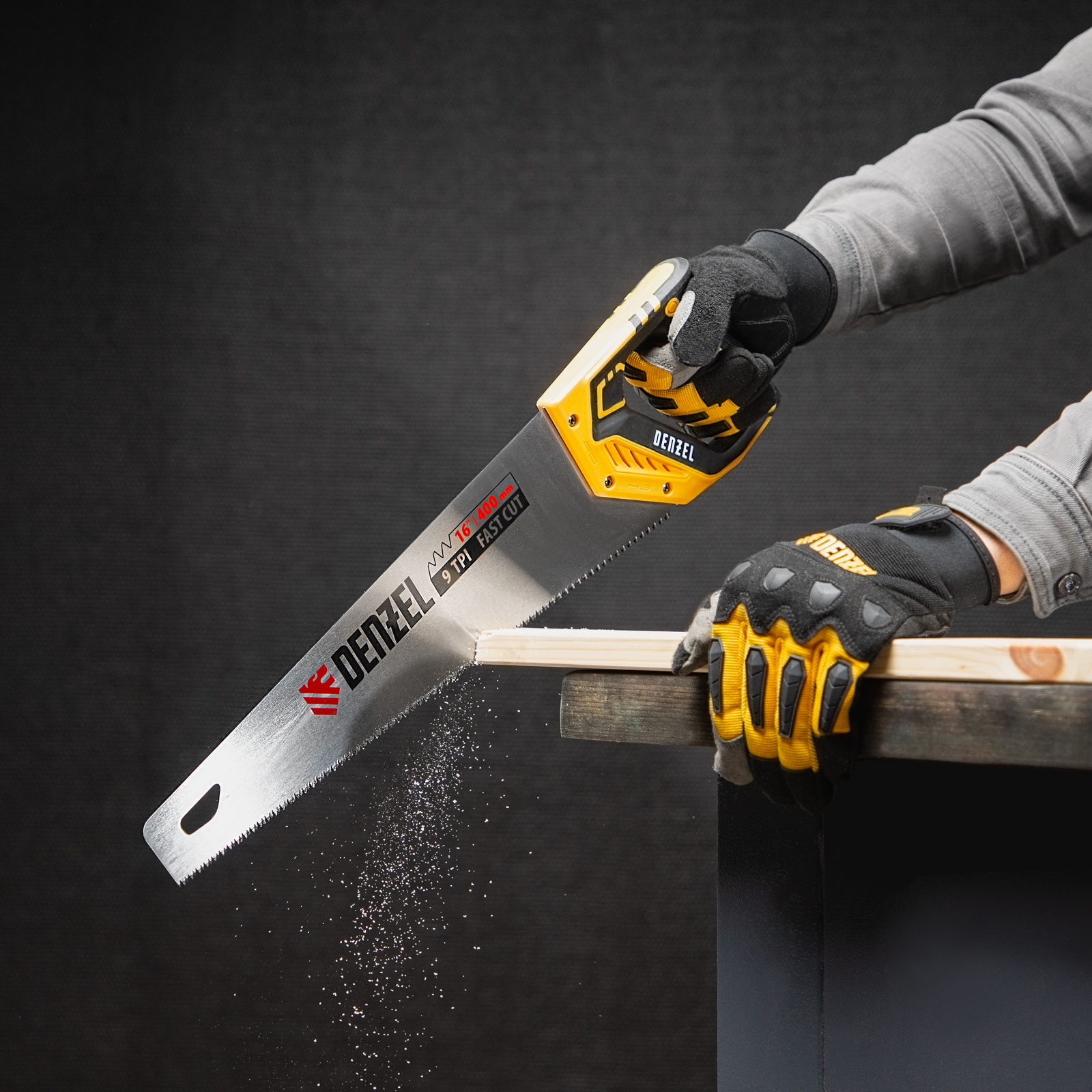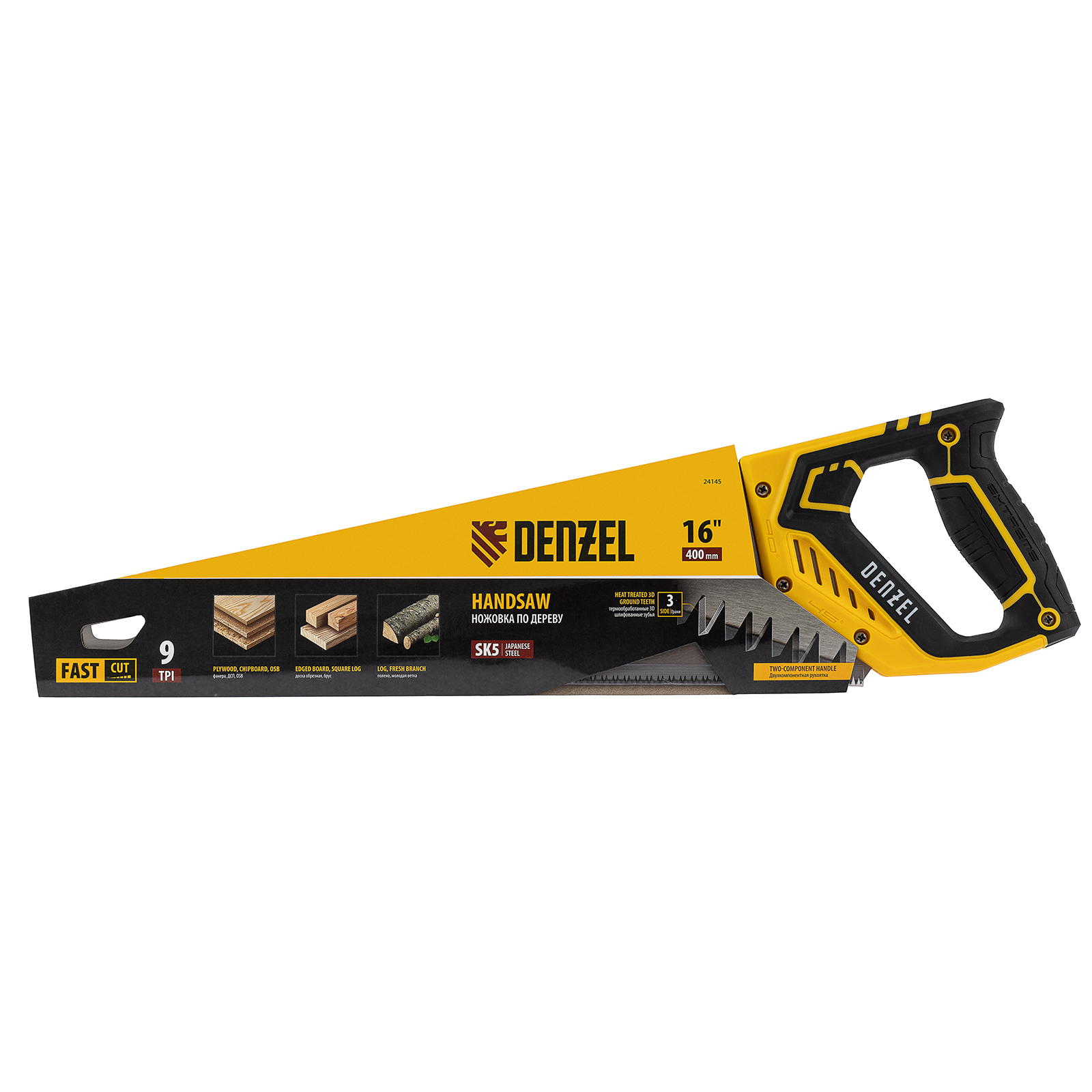 Ножовка по дереву Denzel 24145 длиной 400 мм, с зубьями с шагом 9 TPI и 3D-заточкой, с двухкомпонентной рукояткой, предназначена для продольной и поперечной распиловки заготовок из древесины, ДСП, ДВП, МДФ, ламината, а также из ПВХ (труб, панелей, коробов). Подходит для спиливания молодых веток. Зубья с шагом 9 TPI позволяют выполнять быстрый рез. Ножовка используется для проведения столярных работ в мастерской и на дачном участке.