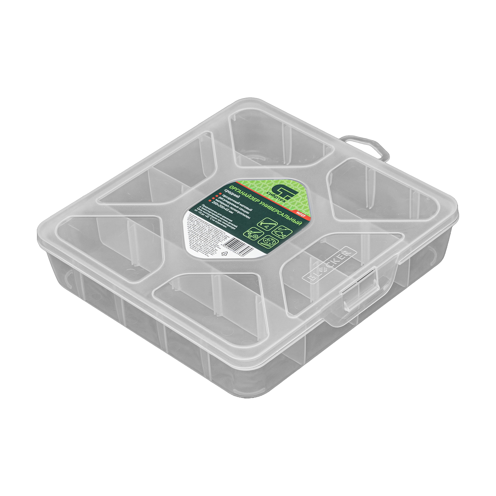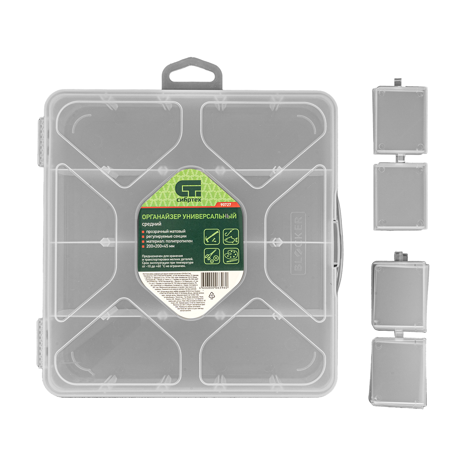 Универсальный средний органайзер Сибртех 90727 размером 200 х 200 х 45 мм, прозрачный матовый, используется для практичного хранения мелких предметов. Он подходит для распределения снастей, крепежа, хозяйственных мелочей и других предметов. Органайзер позволяет компактно расположить вещи в скрытых уголках квартиры: в шкафу, под кроватью и т.д.