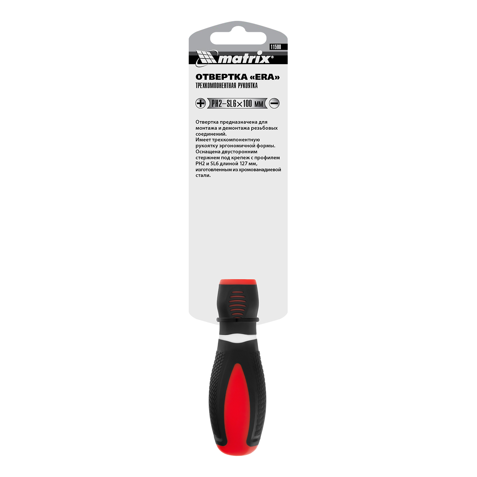 Комбинированная отвертка Matrix 11580 из стали CrV, с двухкомпонентной рукояткой, позволяет монтировать и демонтировать крепеж типоразмера SL6,0 и PH2. Она рассчитана на профессиональное использование, в частности, осуществление строительных и монтажных работ. Благодаря длине стержня 127 мм можно производить работы с крепежом на поверхности и в углублениях.