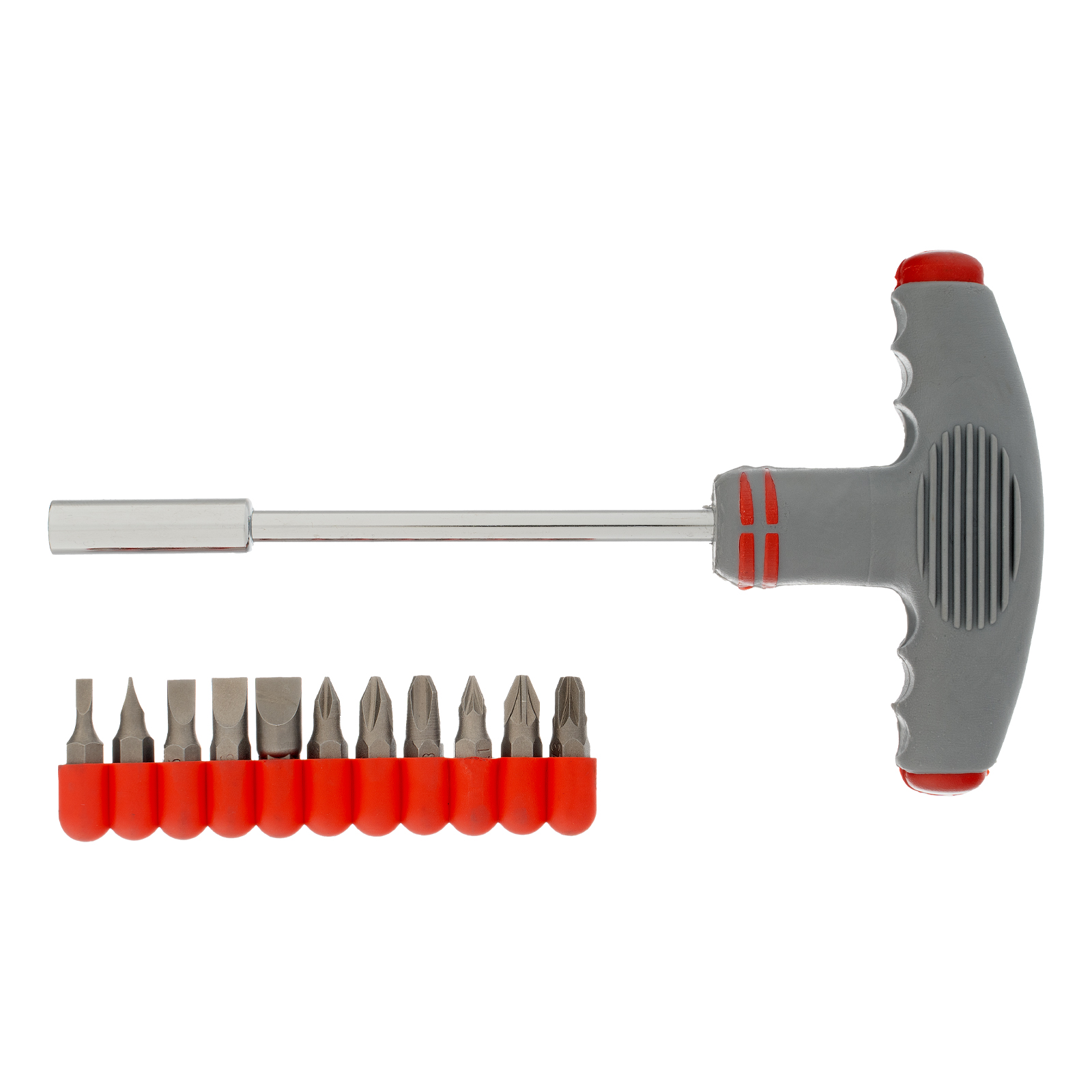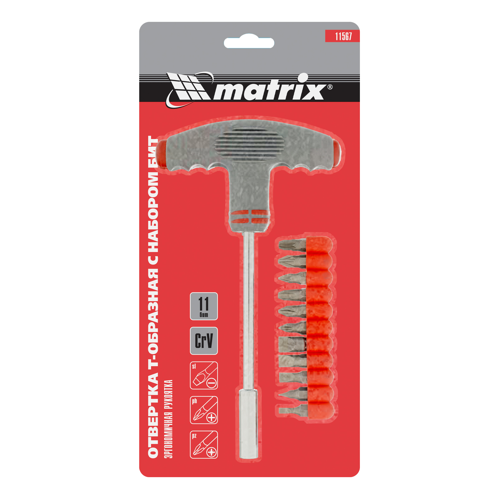 Отвертка с Т-образной эргономичной ручкой и набором бит, 11 шт, CrV Matrix в Уфе