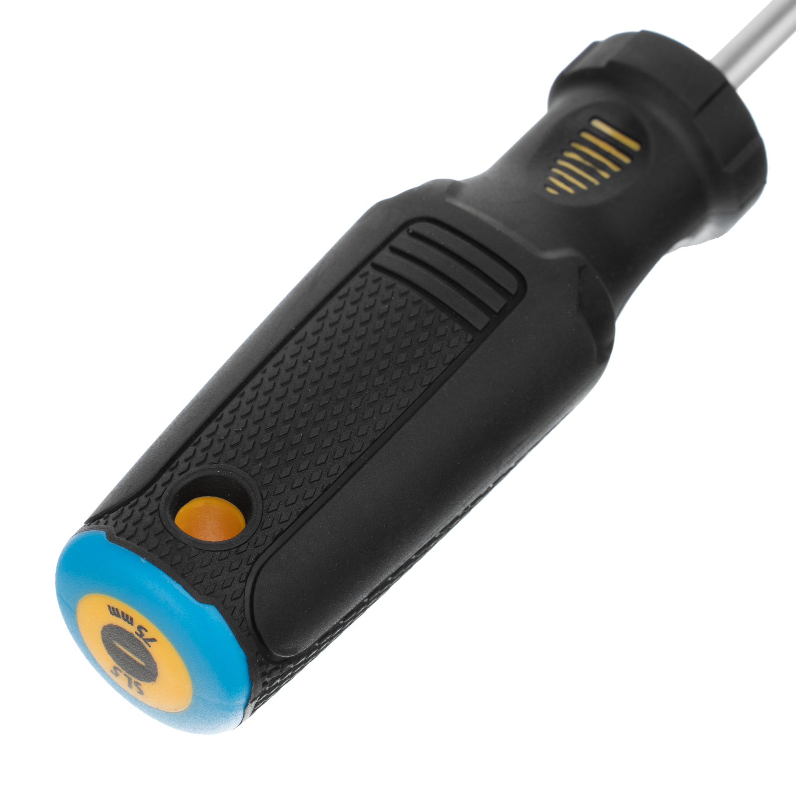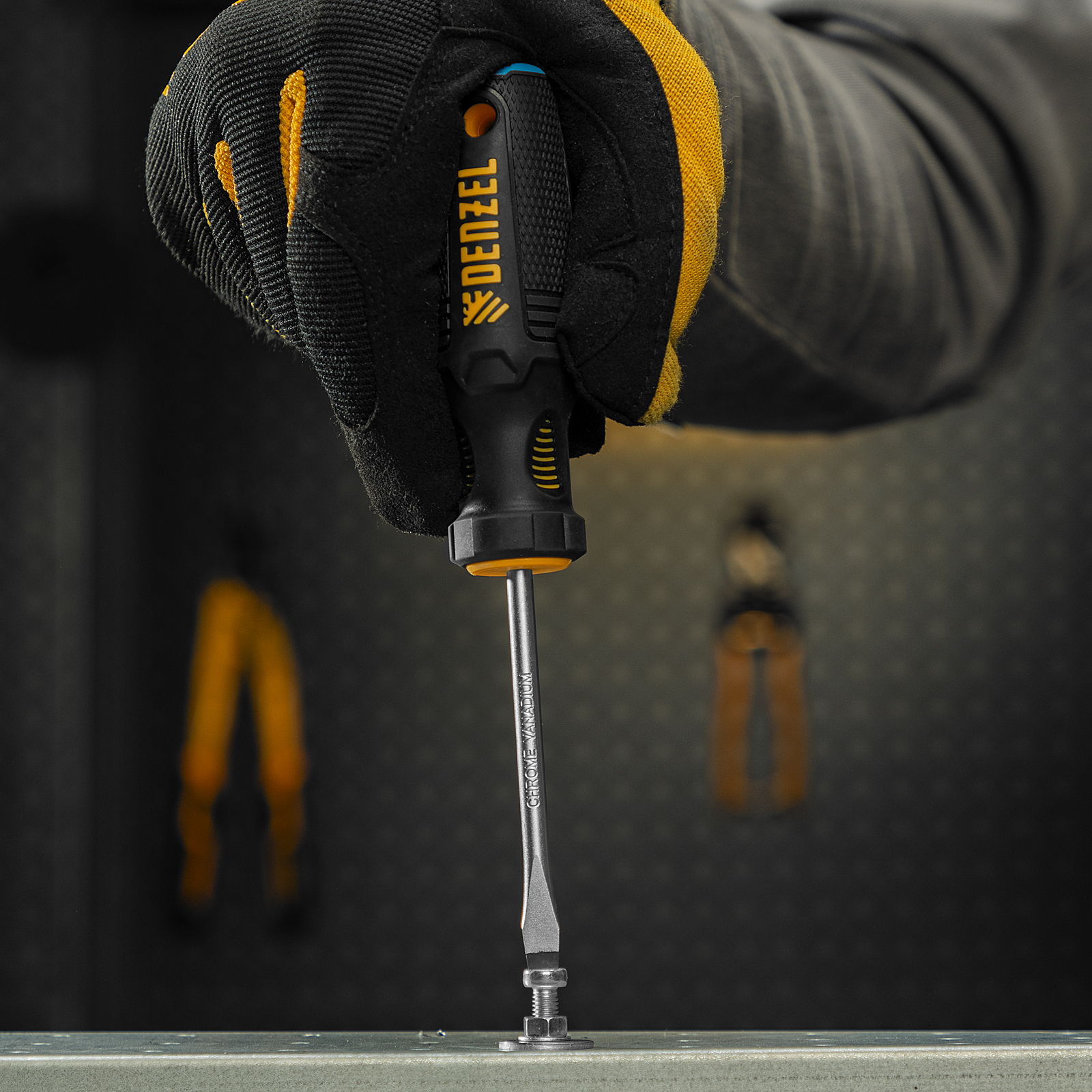 Отвертка SL5 х 75 мм Denzel 12194 из стали CrV, с трехкомпонентной рукояткой, используется для монтажа и демонтажа винтов и саморезов с прямым шлицем Slotted. Намагниченный шлиц крепко фиксируется в головке крепежа. Отвертка выдерживает интенсивное применение и предназначена для выполнения профессиональных ремонтных и монтажных работ.
