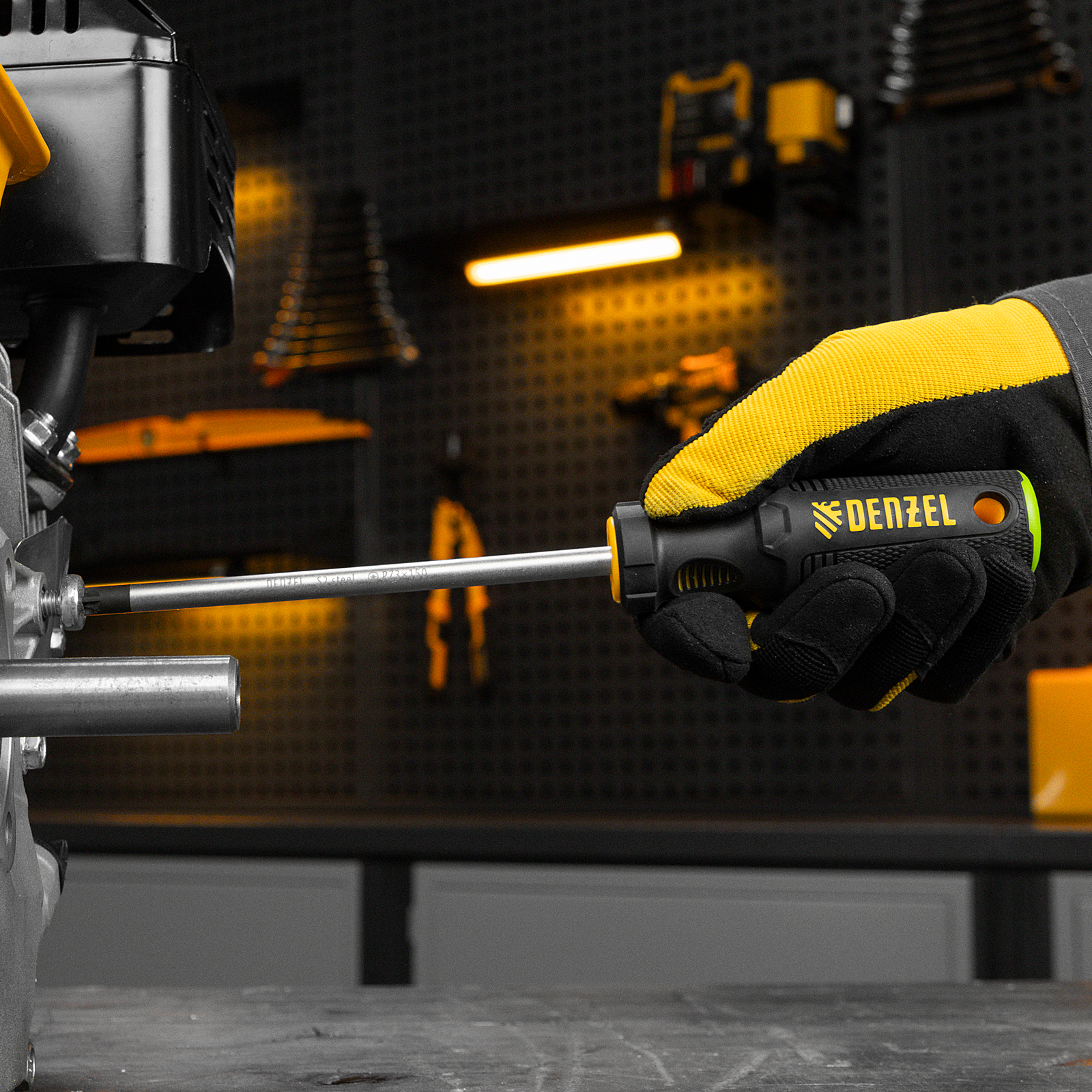 Отвертка Denzel 122097 с трехкомпонентной рукояткой, со стержнем из стали S2, длиной 150 мм, имеет шлиц PZ3 и предназначена для монтажных и демонтажных работ с резьбовыми соединениями типа Pozidriv. Благодаря намагниченному высокоточному шлицу отвертку с крепежом можно направлять одной рукой, удерживая другой закрепляемую деталь. Инструмент подходит для профессионального использования.