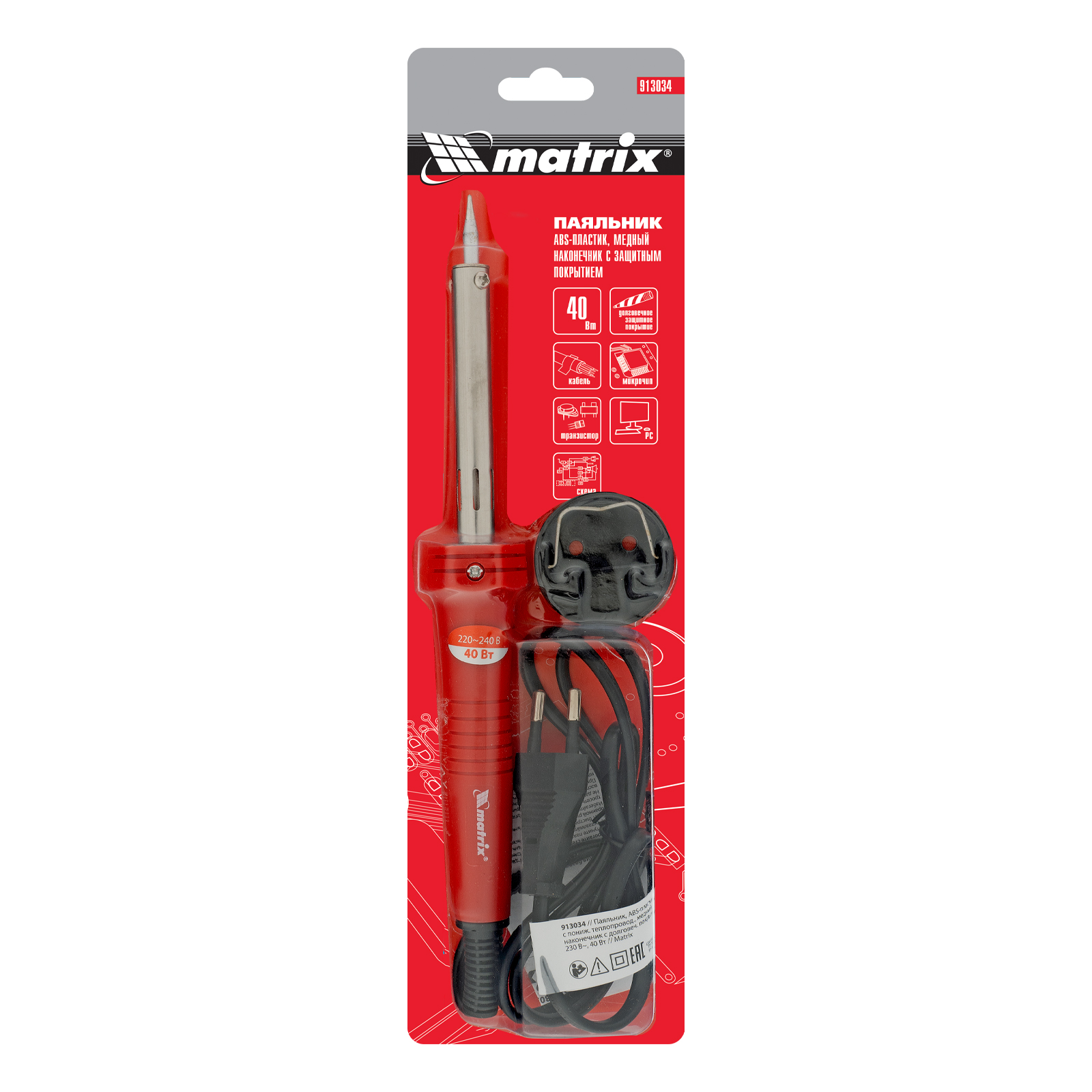 Паяльник, пластик ABS с пониженной теплопроводностью, медный наконечник с долговечным покрытием, 220 В, 40 W Matrix в Уфе