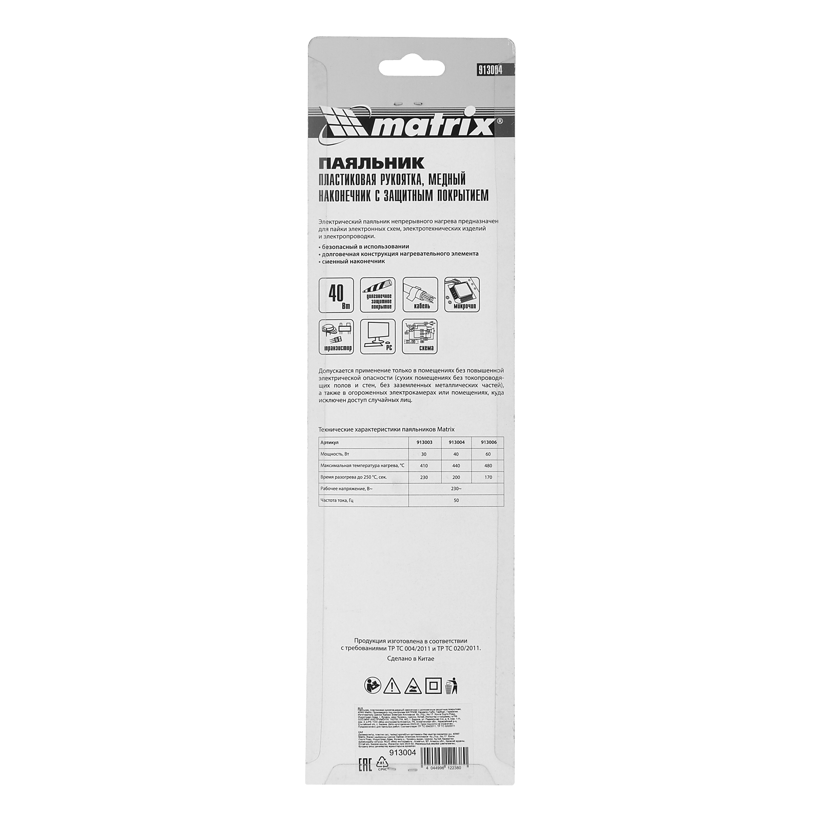 Паяльник, пластиковая рукоятка, медный наконечник с долговечным защитным покрытием, 220 В, 40 W Matrix в Уфе