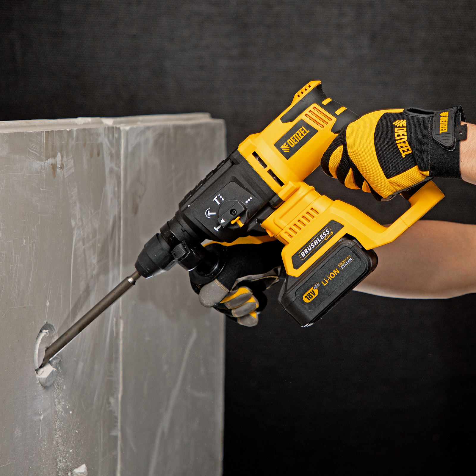 Аккумуляторный перфоратор Denzel BLRH-IB-26 26701 с аккумулятором Li-Ion емкостью 4 Ач и напряжением 18 В предназначен для сверления отверстий в различных материалах, а также для штробления стен, разрушения кирпичной кладки. Поддерживает несколько режимов работы: сверление, бурение, долбление + регулировка положения долота (опция Vario Lock). Максимальный диаметр отверстий в древесине составляет 40 мм, металле — 13 мм, бетоне — 26 мм. Инструмент совершает до 4800 ударов в минуту, развивая энергию до 3 Дж, чем обусловлена его высокая производительность и эффективная работа с твердыми материалами. Перфоратор пригодится для проведения строительных и ремонтных работ.