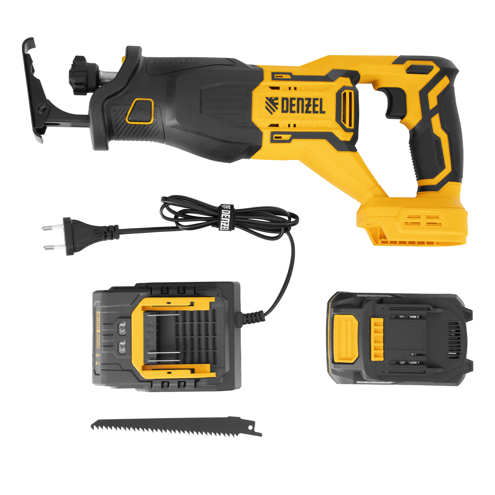 Пила сабельная аккумуляторная - 1 штЛезвие сабельной пилы - 1 штАккумуляторная батарея Denzel Power System - 1 штЗарядное устройство -1 штПолотно пильное по дереву - 1 штПолотно пильное по металлу - 1 штРуководство по эксплуатации с гарантийным талоном - 1 шт |