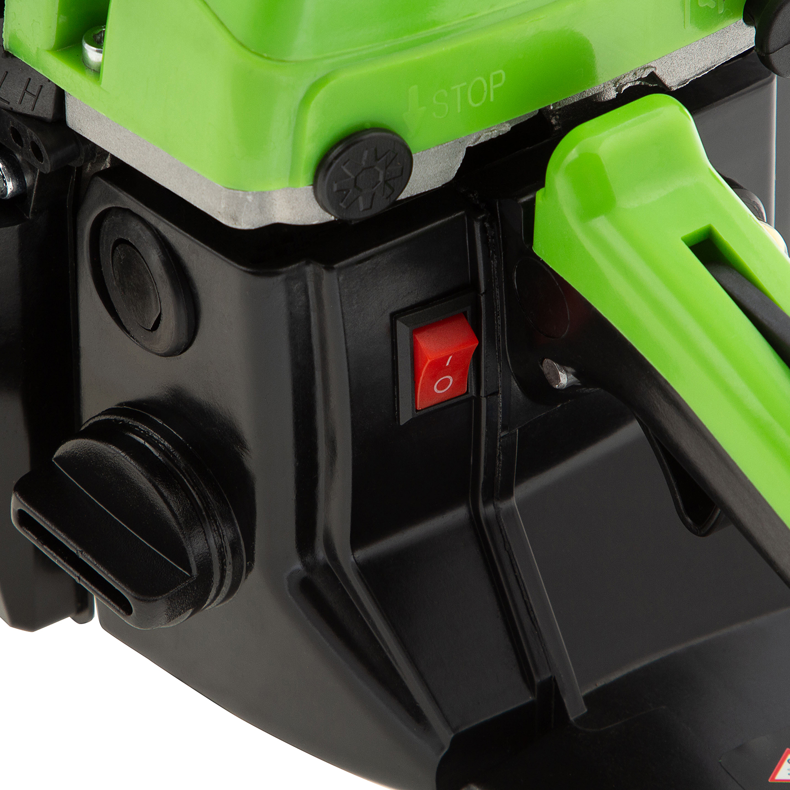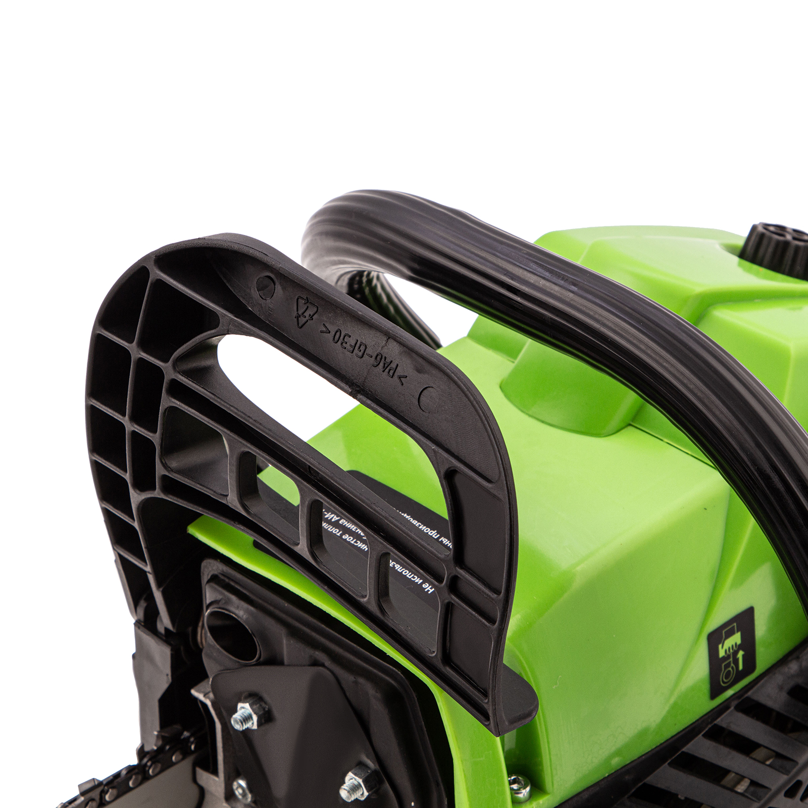 - Безопасность — пила оснащена блокировкой от случайного запуска и тормозом цепи, который моментально срабатывает при отскоке инструмента.