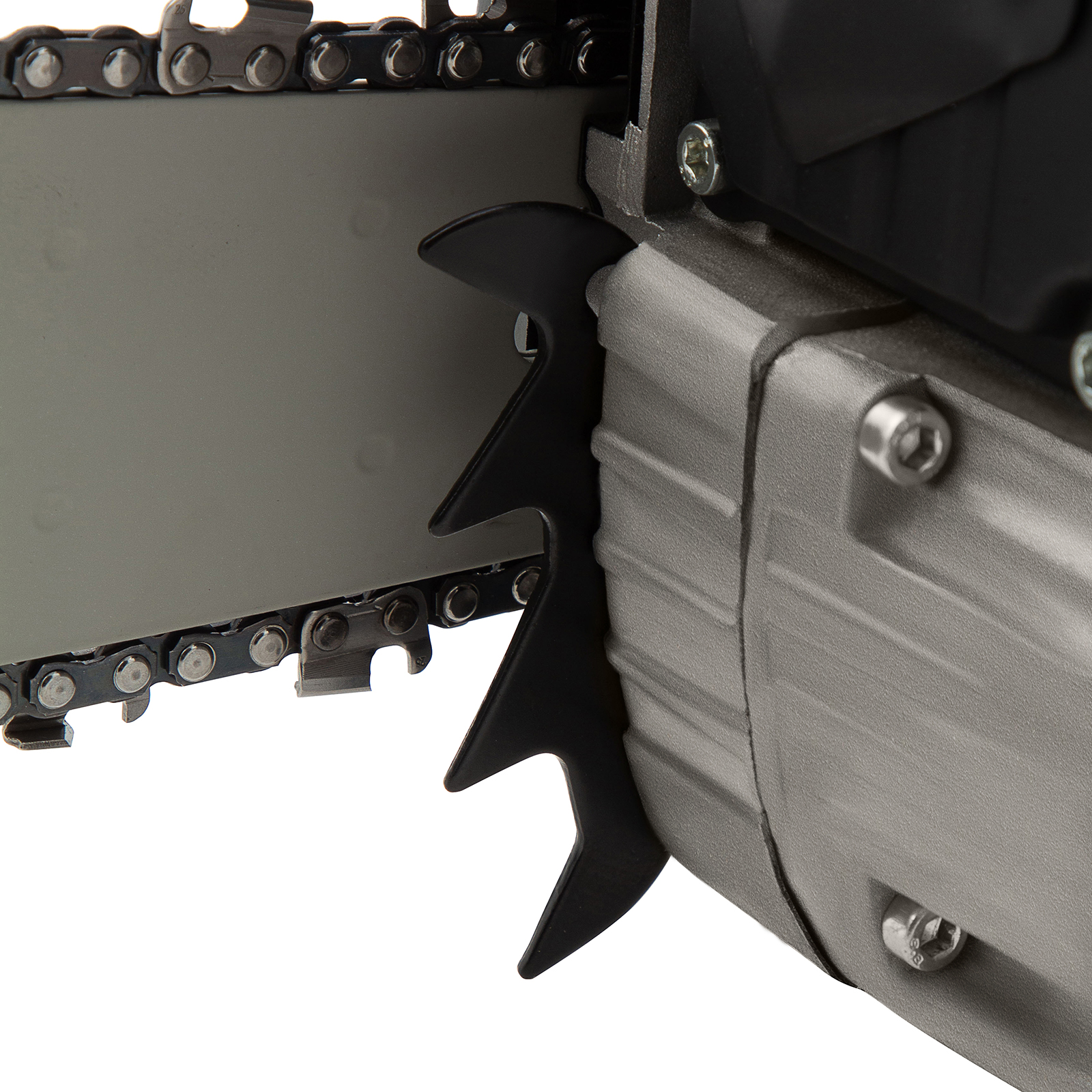 - Стальной зубчатый упор — пилу можно зафиксировать во время работы, это обеспечивает более точный распил и одновременно снижает отдачу.