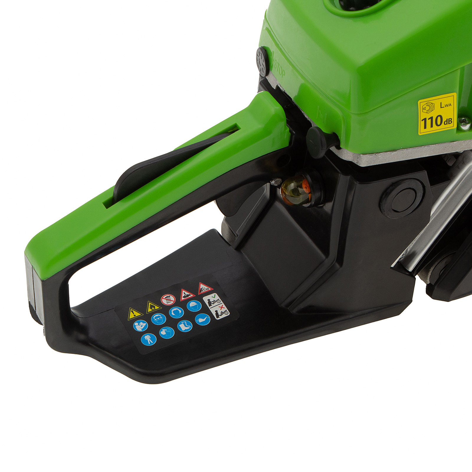 - Безопасность — пила оснащена блокировкой от случайного запуска и тормозом цепи, который моментально срабатывает при отскоке инструмента.