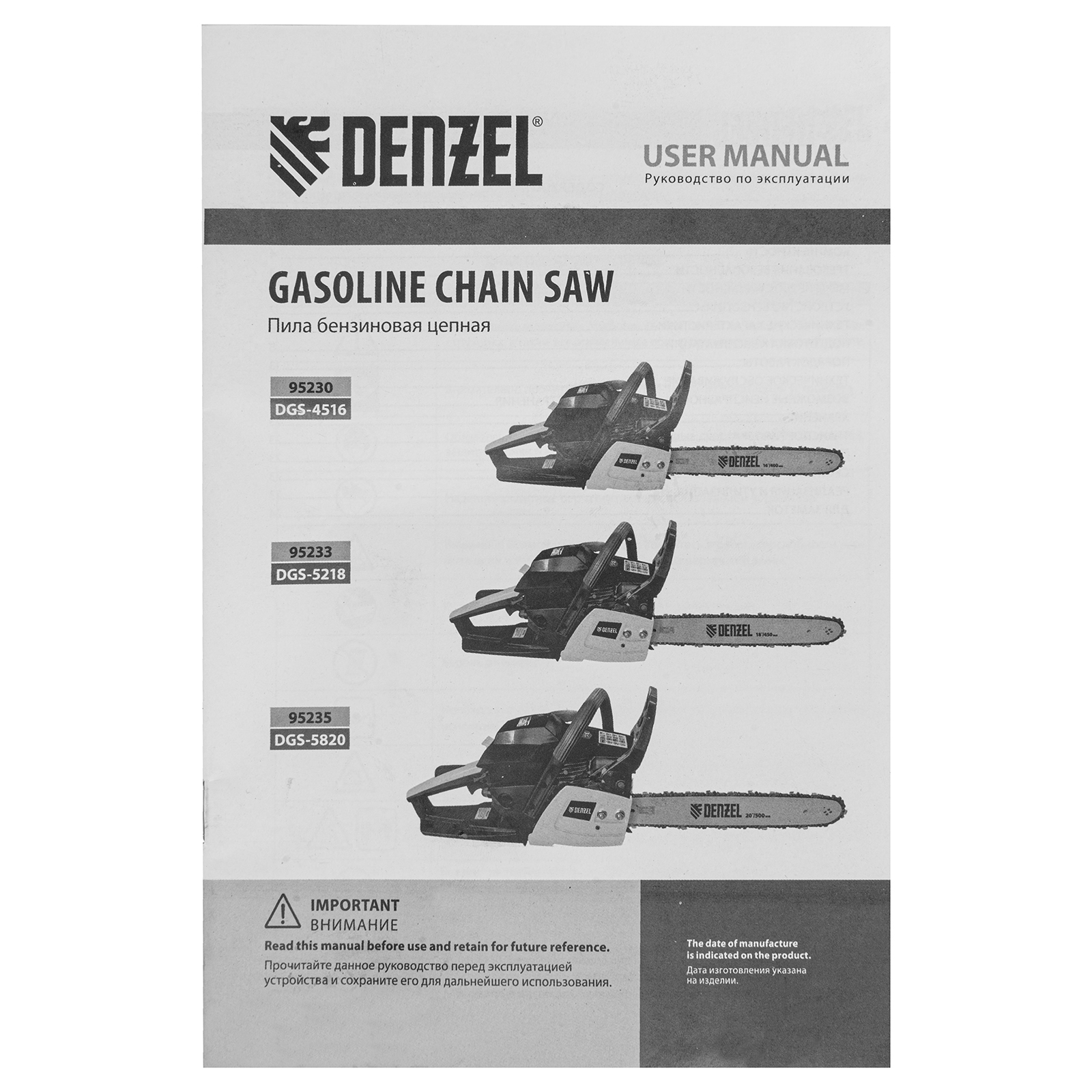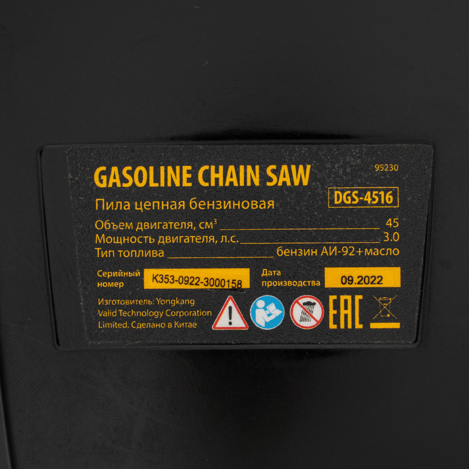 Пила цепная бензиновая DGS-4516, шина 40 см, 45 см3, 3 л.с, шаг 3/8, паз 1.3 мм, 57 звеньев Denzel в Уфе