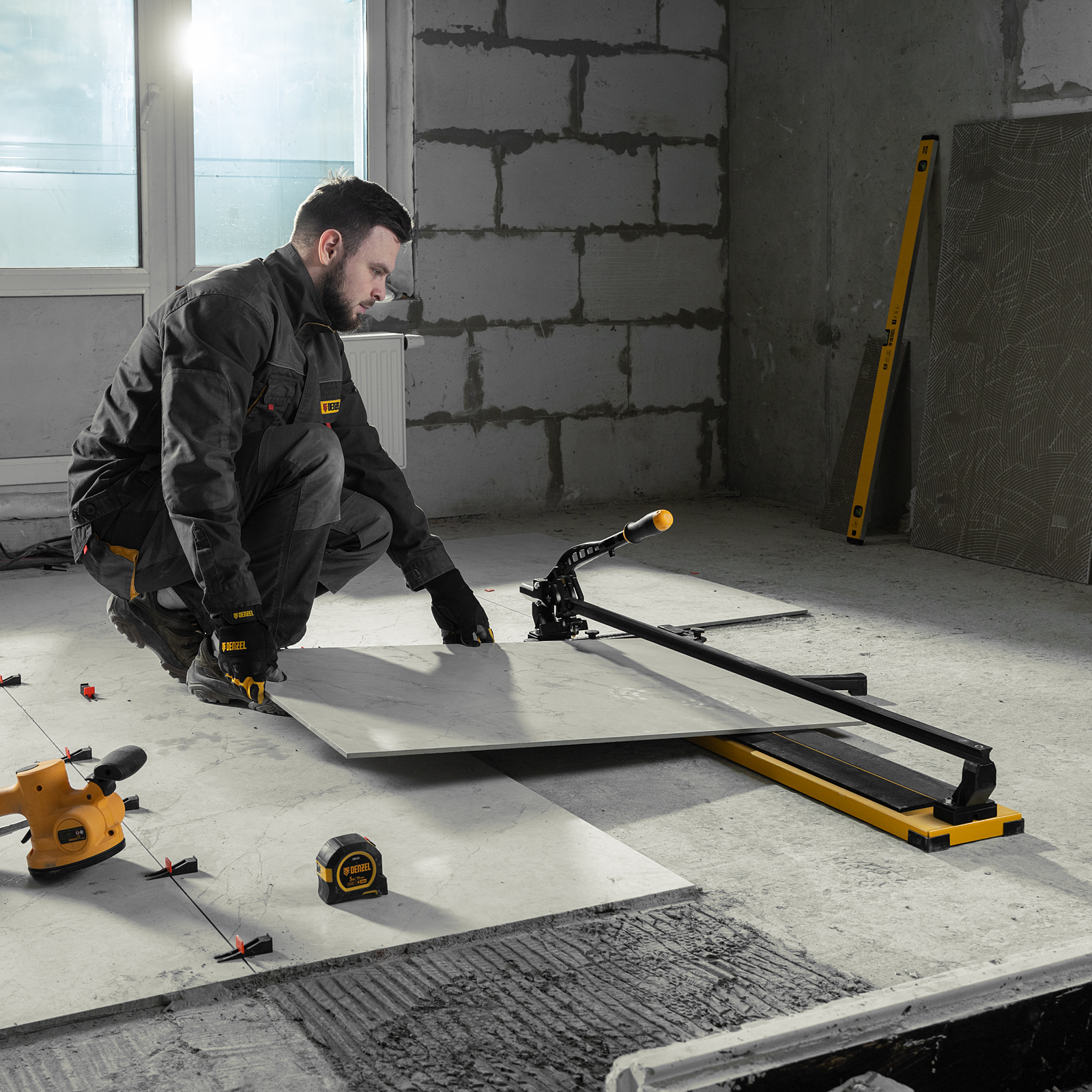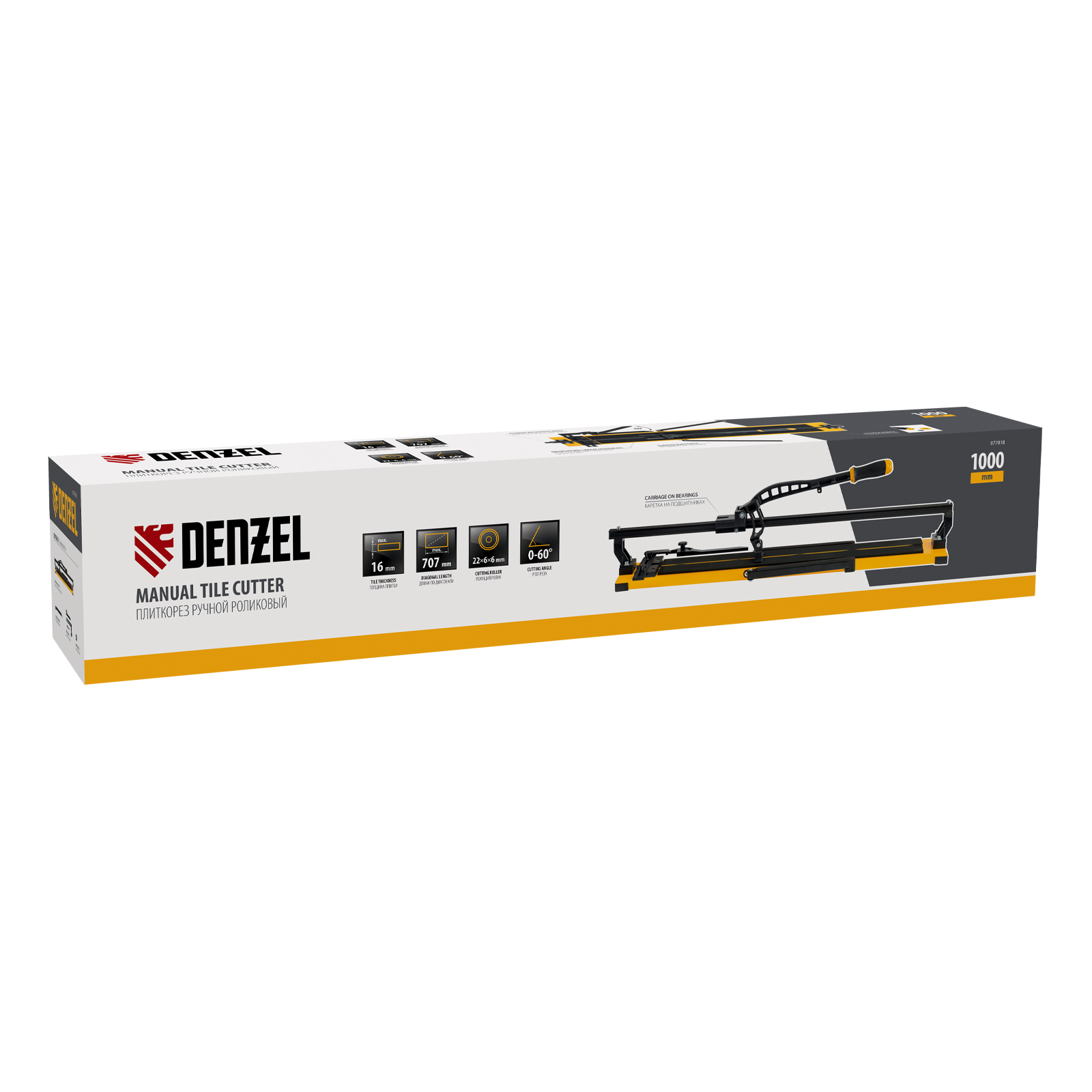 Ручной плиткорез Denzel 877018 с рельсовой направляющей и стальной станиной, с кареткой на подшипниках и усиленной рукояткой-пеналом, предназначен для прямой и диагональной резки керамической плитки и керамогранита длиной до 1000 мм и толщиной до 16 мм. Раздвижные упоры упрощают работу с плиткой большого размера. Инструмент используется для проведения отделочных работ.