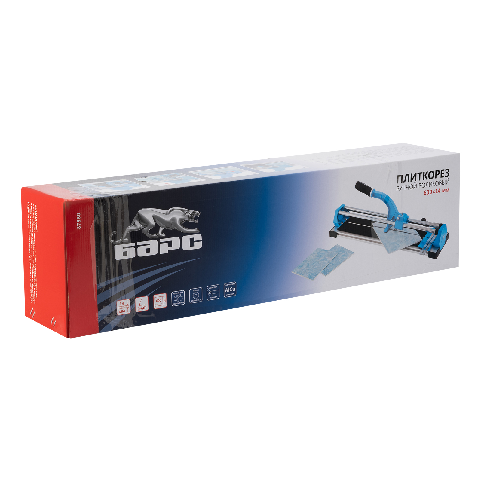 Плиткорез ручной Барс 87580 с кареткой на подшипниках, усиленной рукояткой и облегченной алюминиевой станиной, предназначен для резки плитки из кафеля и керамогранита длиной до 600 мм и толщиной до 14 мм. Благодаря регулируемому боковому упору удобен для серийной резки. Инструмент подходит для бытового и профессионального использования, оптимален для выполнения больших объемов облицовочных работ.