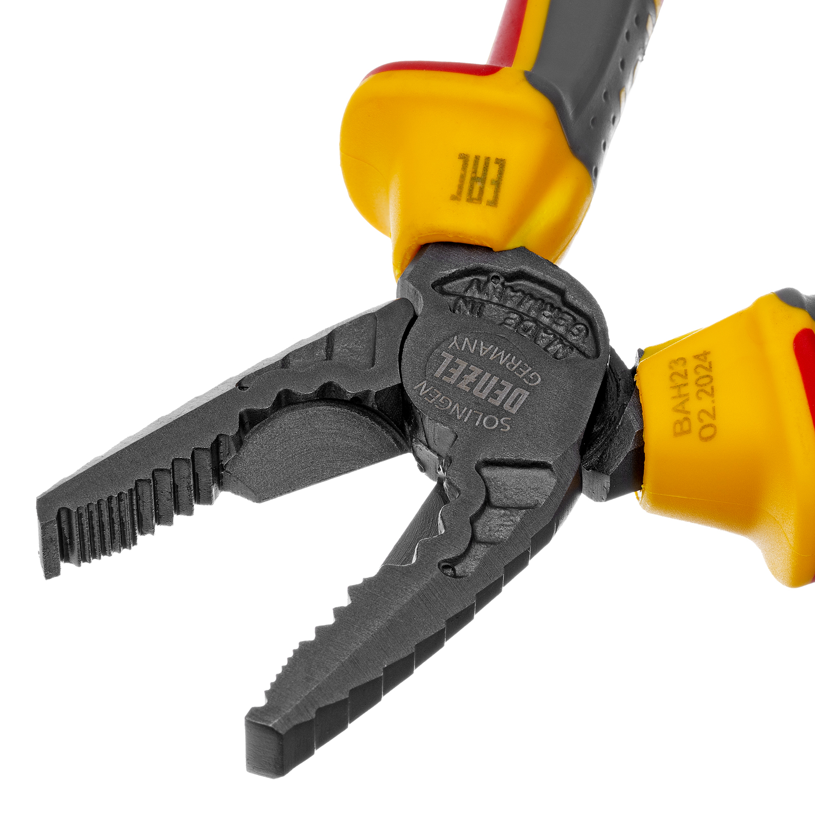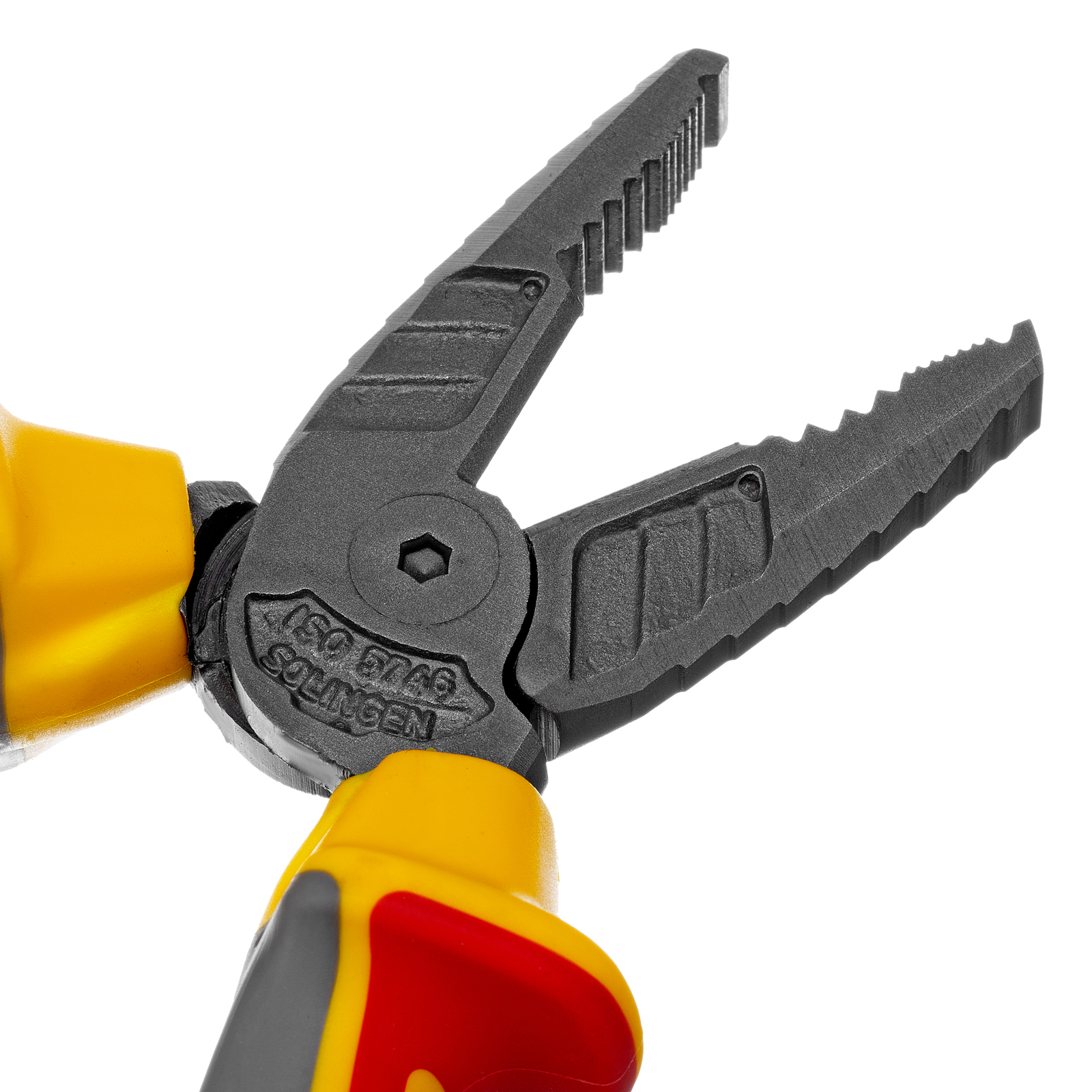 Комбинированные плоскогубцы Denzel 17086 длиной 180 мм, с диэлектрическими трехкомпонентными рукоятками, выдерживающими до 1000 В, предназначены для выполнения работ с токопроводящими элементами. С их помощью можно захватить или согнуть мелкие и крупные детали, перекусить проволоку или перерезать провод. Инструмент подходит для работы с мягкой проволокой (алюминиевой, медной, с пределом прочности 220 Н/мм2) диаметром до 5,2 мм, проволокой средней жесткости и гвоздями (750 Н/мм2) диаметром до 3,4 мм, и жесткой (предел прочности 1800 Н/мм2) толщиной до 2,2 мм. Также плоскогубцы можно использовать в качестве гаечного ключа. Инструмент незаменим для проведения слесарных и монтажных работ с различными компонентами и материалами. Внимание: перед началом работ следует отключить напряжение!