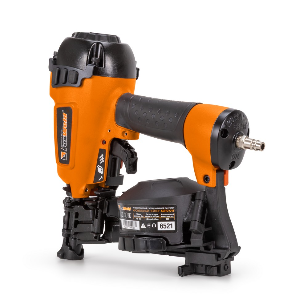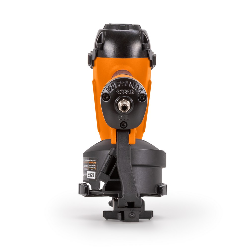 Кровельный пневматический гвоздезабивной пистолет или нейлер AERO C45 - мощный профессиональный инструмент для надежного забивания гвоздей в любую породу дерева. Предназначен для монтажа мягкой черепицы, кровельной дранки, обустройства заборов из мягких материалов и утепления черновых полов. Устройство позволяет регулировать глубину забивания гвоздей. Контактный предохранитель защитит от случайного выстрела. Удобный спусковой крючок обеспечит быструю работу. Инструмент использует кровельные барабанные гвозди CRN длиной от 19 до 45 мм. Поворотный дефлектор, находящийся на крышке инструмента, позволит выбрать наиболее комфортное для пользователя и окружающих направление выхода воздуха. Эргономичная прорезиненная рукоятка снижает усталость и дискомфорт во время работы. Для работы инструмента необходим воздушный компрессор и подготовленная воздушная магистраль. AERO C45 имеет следующие рабочие параметры - рабочее давление - 4,8 - 8,0 бар и расход воздуха - 1,2 л / выстрел (при 6,0 бар). Для быстрого и надежного подключения оснащается быстросьемным разъемом - Rapid M "папа".