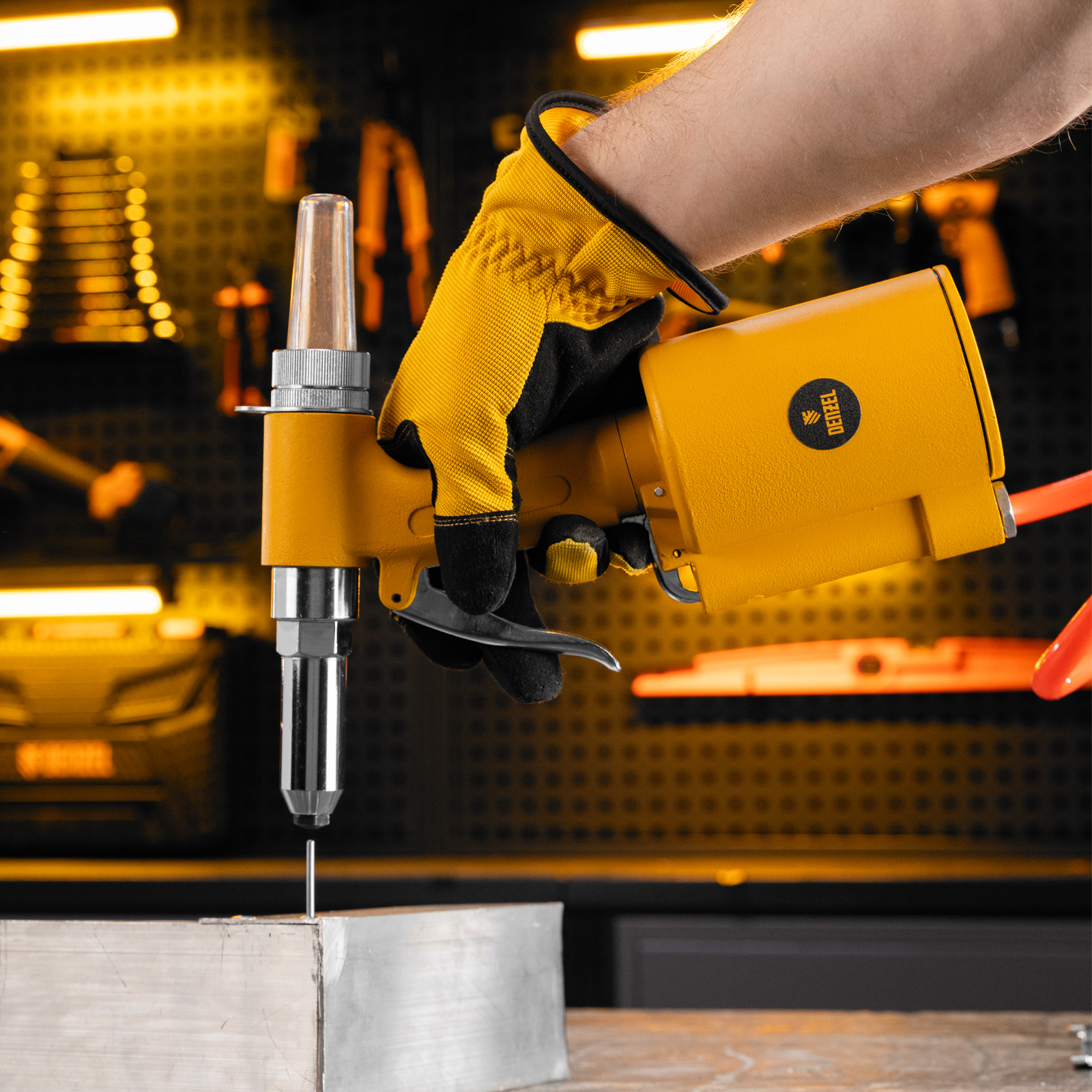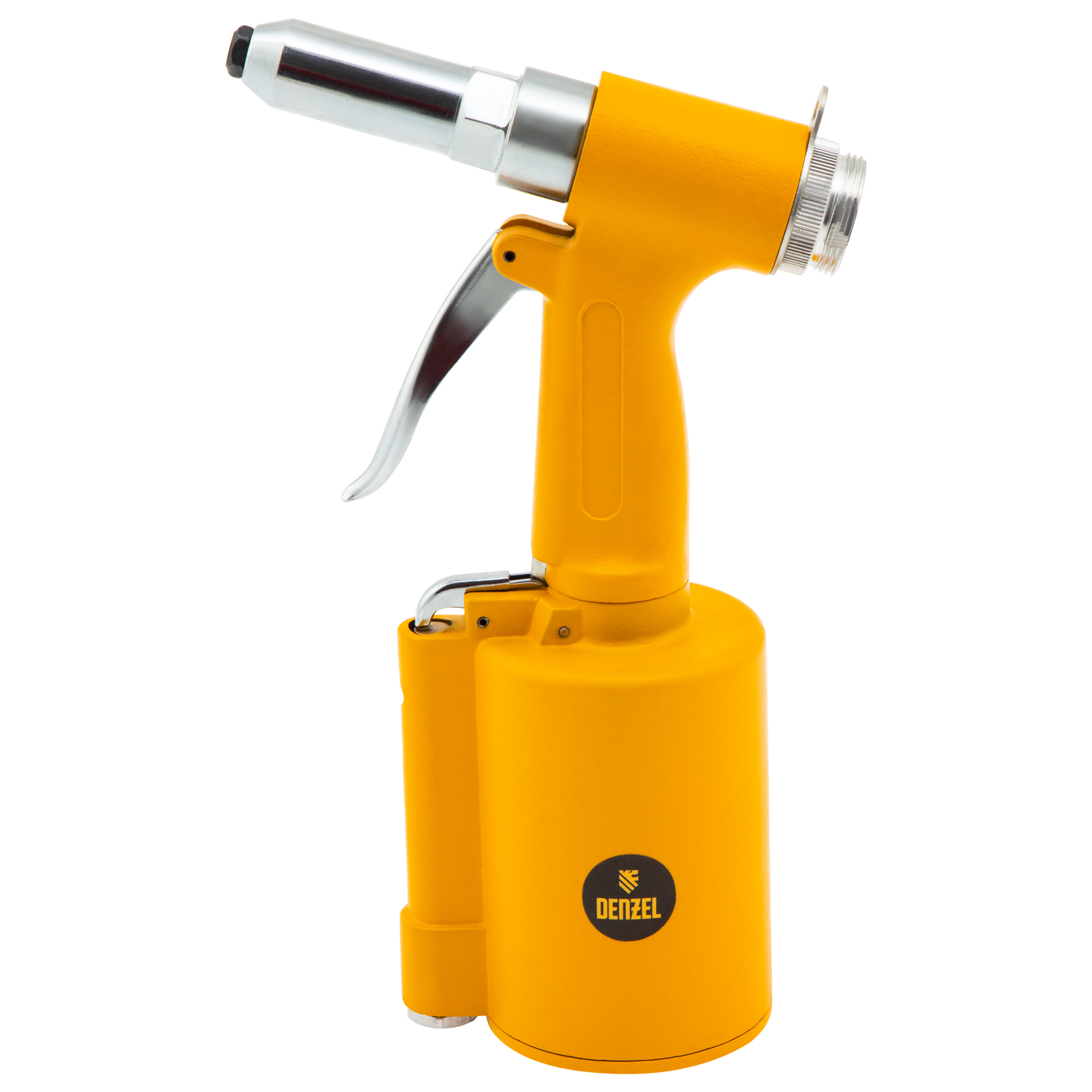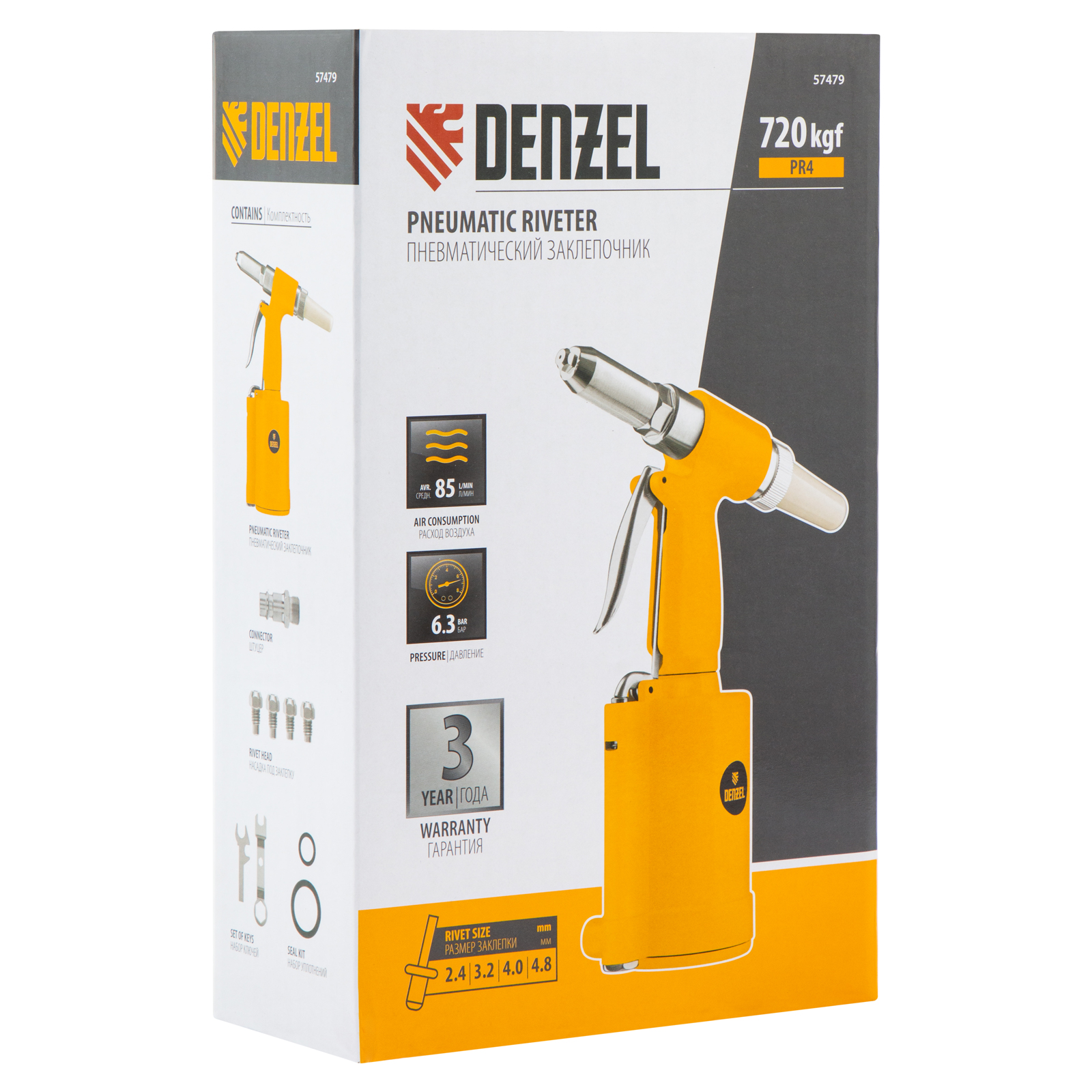 Пневматический заклепочник Denzel PR4 57479 значительно упрощает работу в автосервисах, домашних мастерских, на малых предприятиях и на ремонтных площадках. С его помощью можно без усилий скрепить листовой, профильный и панельный материал из пластика и металла.,Пистолет для вытяжных заклепок работает под давлением 6,3 АТМ и расходует всего 85 литров воздуха в минуту, поэтому для него подойдет компрессор средней мощности. В качестве оснастки используются заклепки размером 2,4-4,8 мм. В комплект поставки входит 4 насадки под заклепки размерами 2,4 мм, 3,2 мм, 4 мм и 4,8 мм.