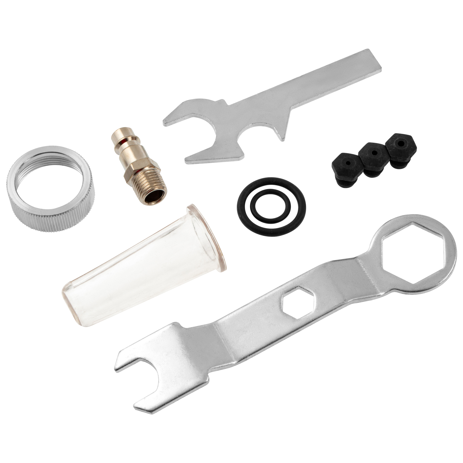 Заклепочник - 1 штШтуцер - 1 штНасадка под заклепку - 4 штНабор ключей и уплотнителей - 1 шт |