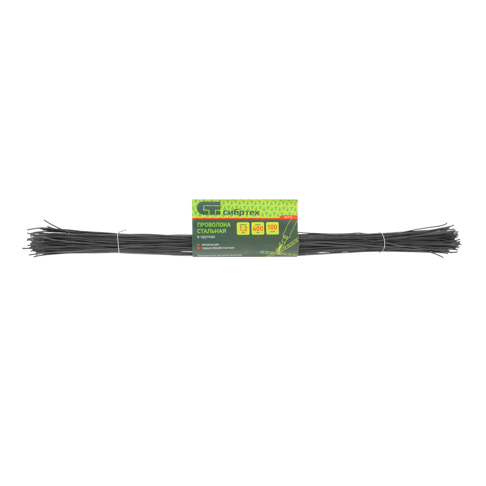Вязальная стальная проволока в прутках Сибртех 84915, термообработанная, длиной 400 мм и диаметром 1,2 мм, 100 шт., предназначена для вязки стальных сеток и арматуры. Пригодится на строительных площадках для армирования конструкций из железобетона.