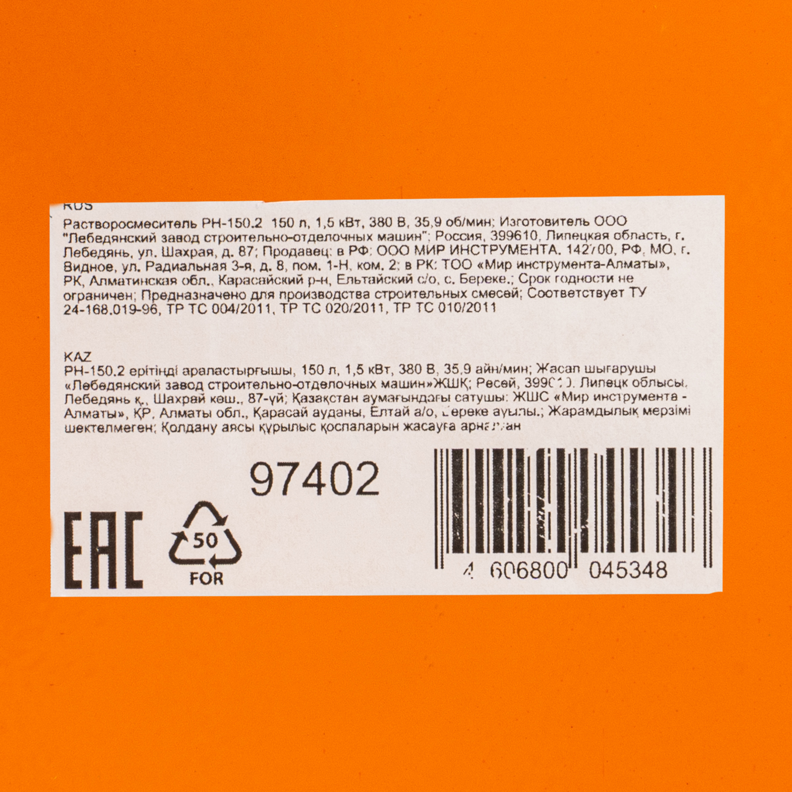 Растворосмеситель РН-150.2 97402 мощностью 1,5 кВт, с барабаном объемом 150 л, работает от сети 380 В, обеспечивает частоту вращения вала 35,9 об/мин и предназначен для приготовления влажных растворов и сухих смесей. Кладочные, облицовочные и штукатурные смеси производятся в соответствии с ГОСТ 28013 с подвижностью от 5 см по конусу (ГОСТ 5802). 4 подвижные лопасти, расположенные на горизонтальном валу, обеспечивают быстрое и качественное перемешивание компонентов раствора за 120 секунд. Сразу же после выгрузки полученной смеси можно начинать новый цикл, что значительно ускоряет рабочий процесс. Растворосмеситель используется для заливки и обработки фундамента, кладки кирпича, выравнивания стен и проведения иных работ.